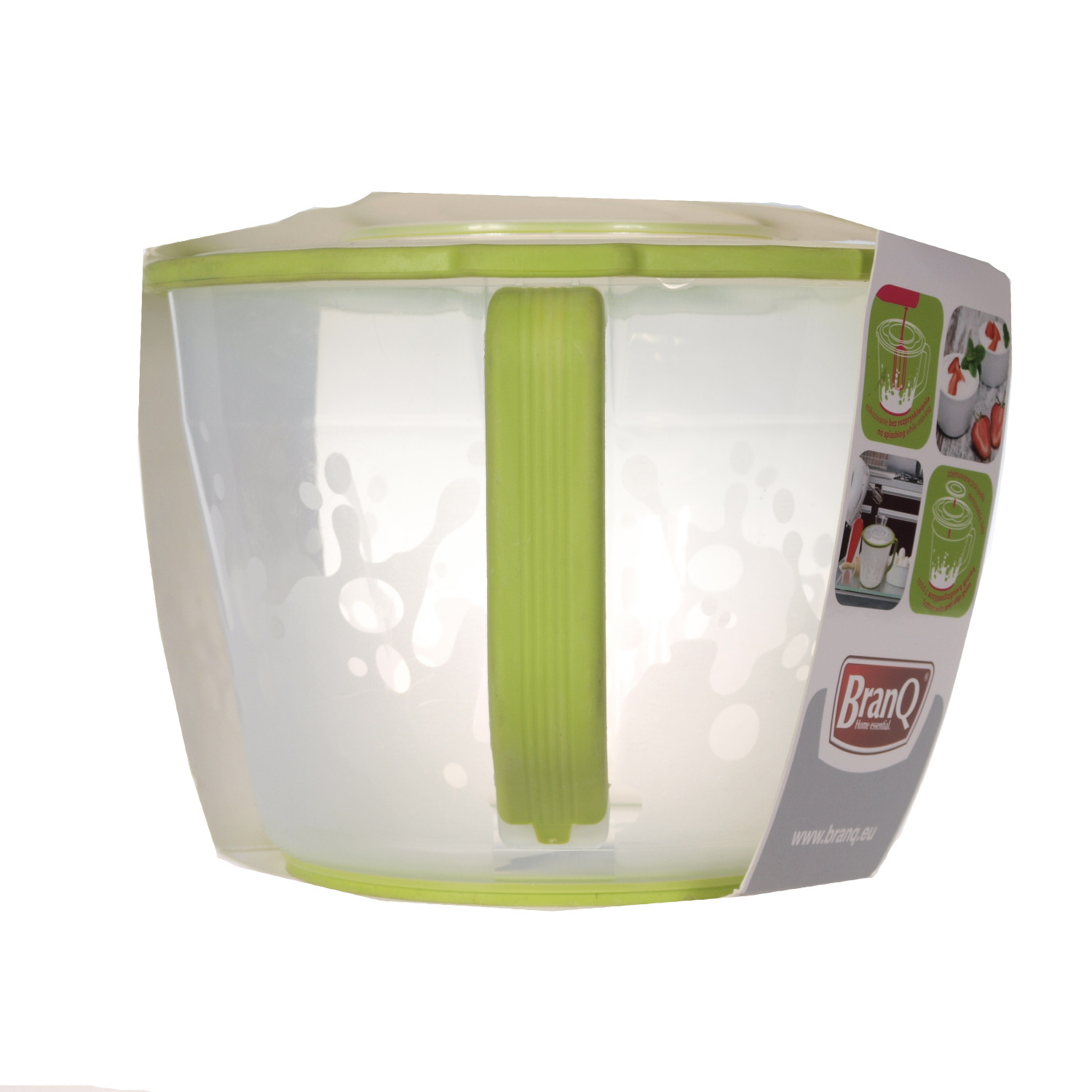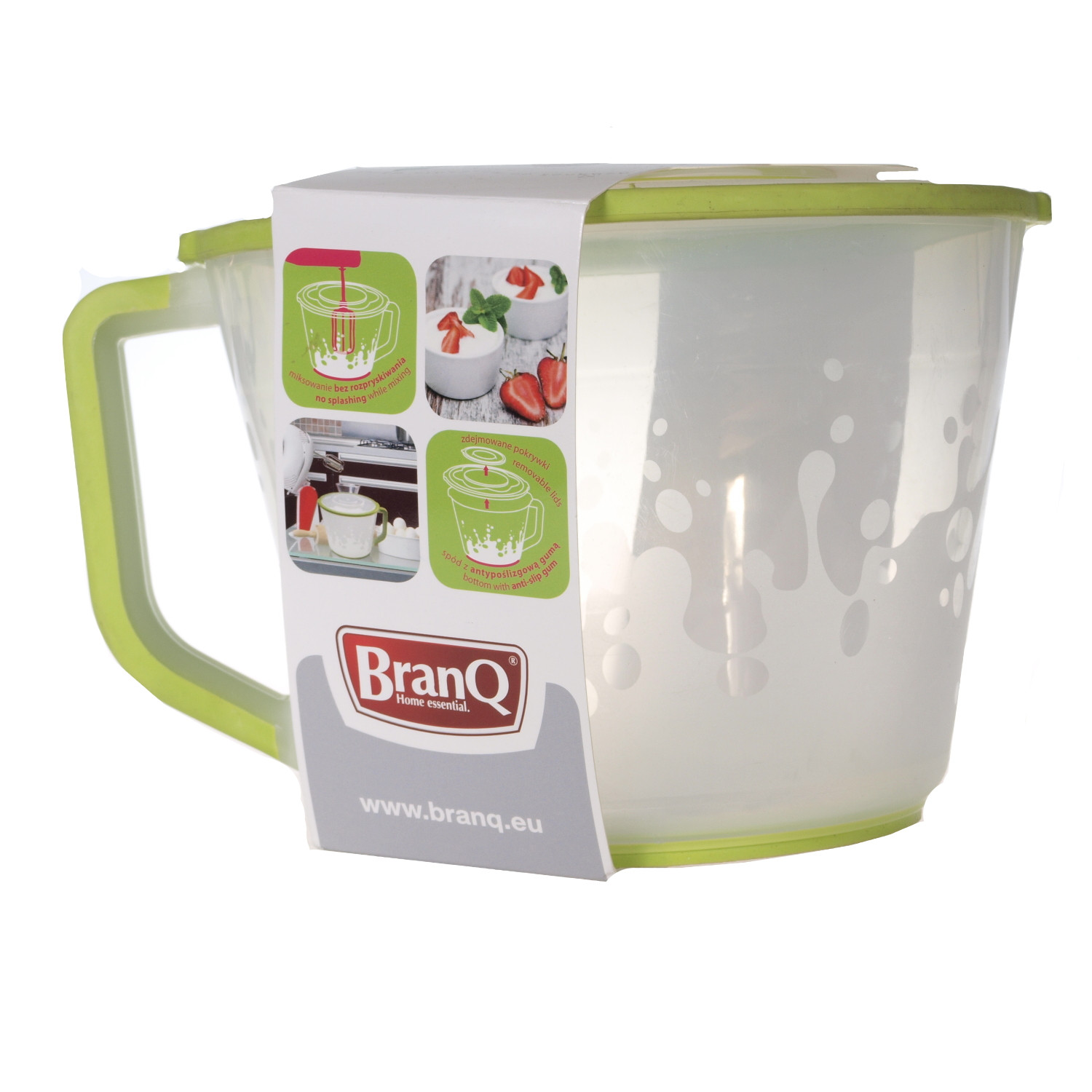 Świetnie sprawdzi się podczas prac kuchennych. Ma podgumowany spód, co uniemożliwia jego przesuwanie podczas miksowania.Wyposażony jest także w wygodną rączkę oraz pokrywę ze zdejmowanym środkiem, która umożliwia włożenie trzepaczek miksera do dzbank
