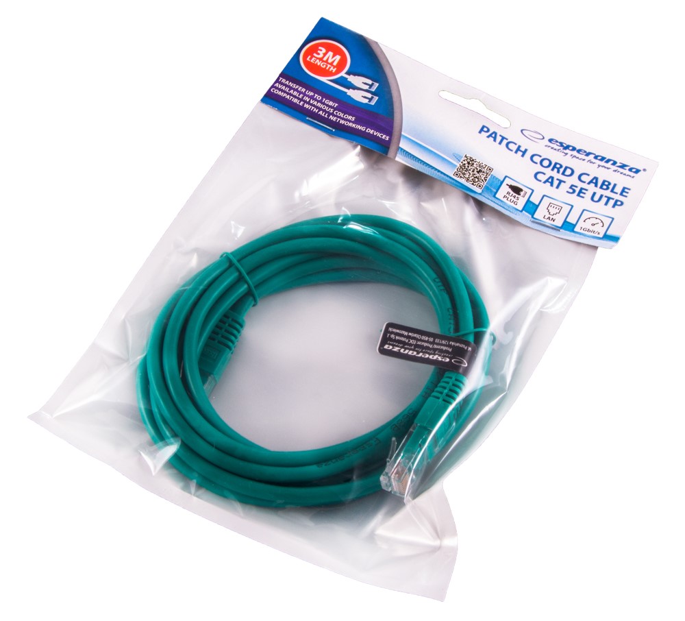 EB275G Kabel UTP CAT 5E patchcord 3m zielony EsperanzaKabel sieciowy, nieekranowany, CAT 5e, znajdujący zastosowanie w domu, biurze i w przemyśle w sieciach LAN, Ethernet, xDSL i innych - służy do połączeń krosowych z urządzeniami takimi jak switch,