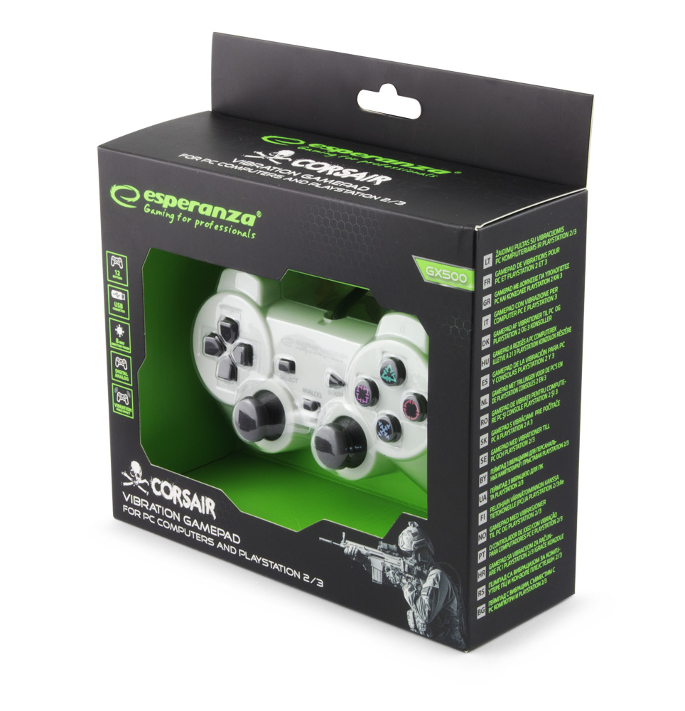 EGG106W Gamepad PC/PS3/PS2 USB Corsair biało-czarny EsperanzaFunkcjonalny gamepad z wibracjami do konsol PS2, PS3 oraz komputerów PC. Idealnie współpracuje z zaawansowanymi grami. Ergonomiczny kształt ułatwia trzymanie i