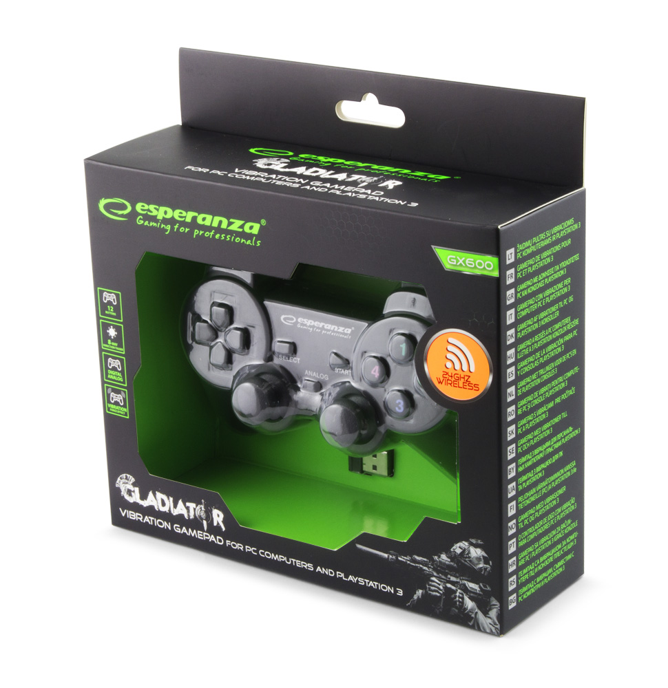 EGG108K Gamepad bezprzewodowy PC/PS3 USB Gladiator czarnyFunkcjonalny bezprzewodowy gamepad z wibracjami. Idealnie współpracuje z zaawansowanymi grami. Ergonomiczny kształt ułatwia trzymanie i nie powoduje zmęczenia dłoni w czasie gry.