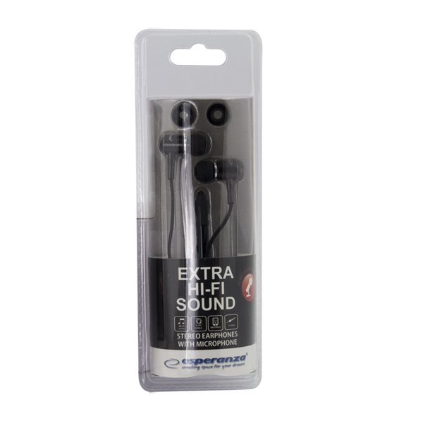 EH162K Słuchawki douszne Mobile czarne EsperanzaPrzewodowe, metalowe słuchawki, dokanałowe z mikrofonem. Kabel słuchawek został pokryty materiałem zabezpieczającym kabel przed uszkodzeniem. Obok mikrofonu wbudowany został przycisk umożliwiający odbi&
