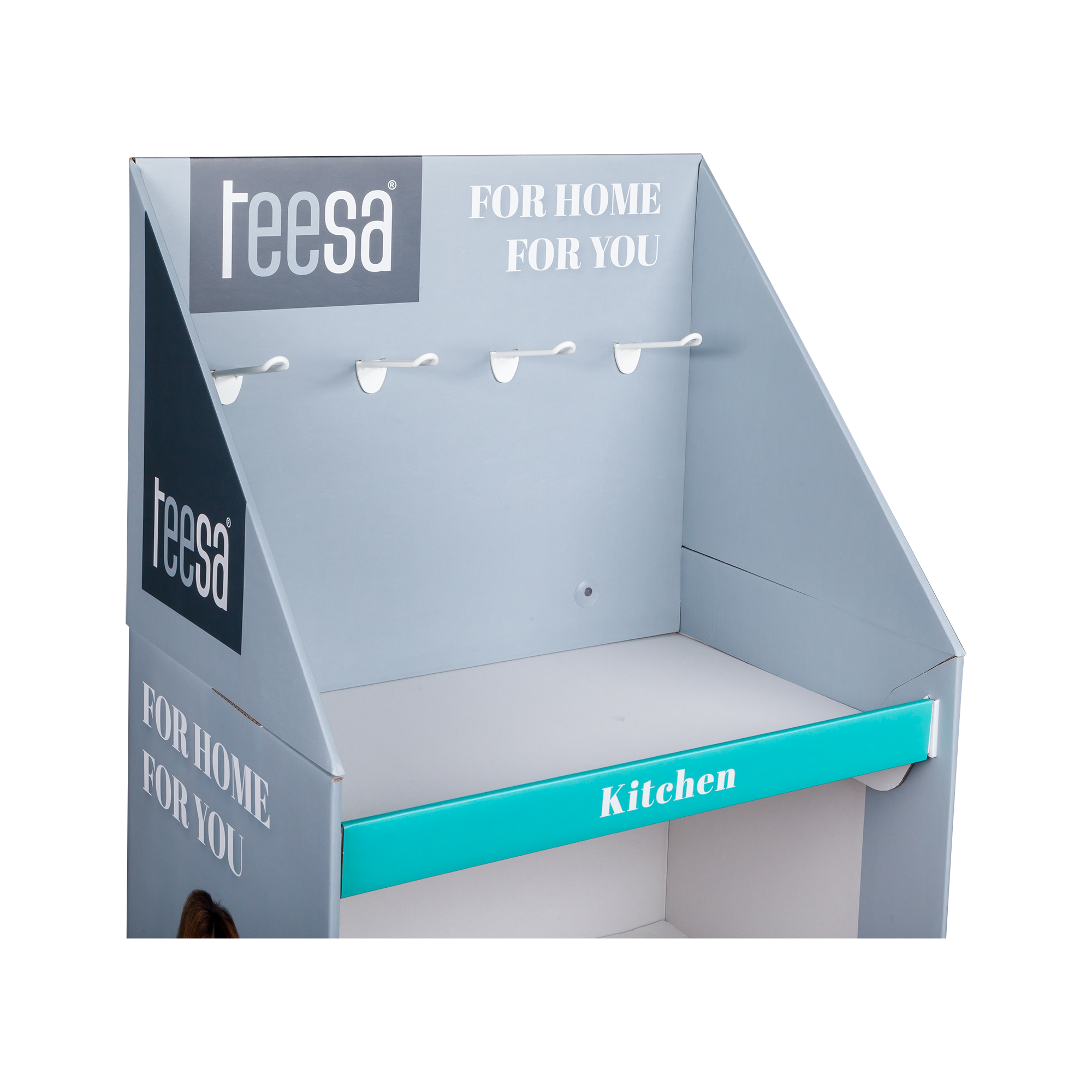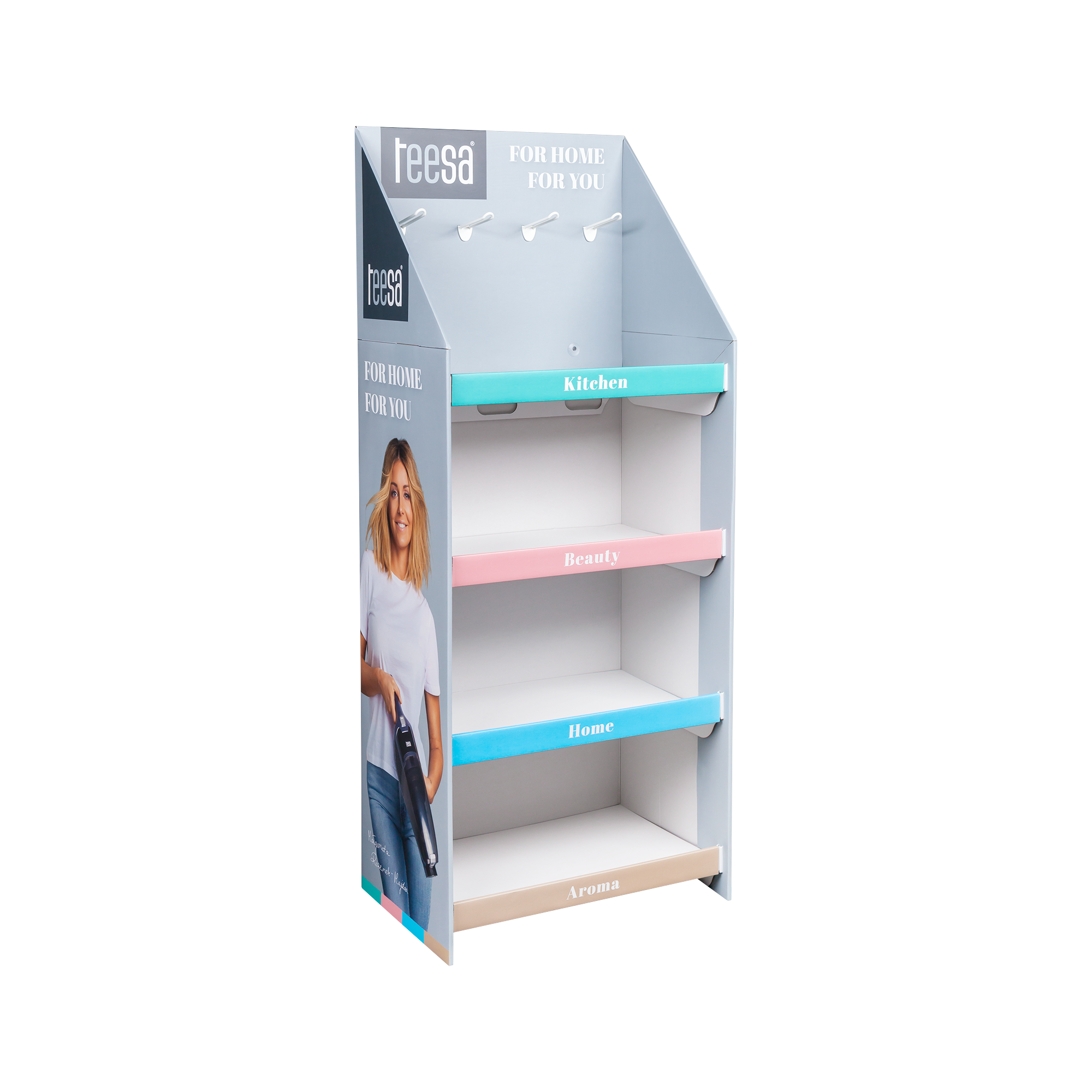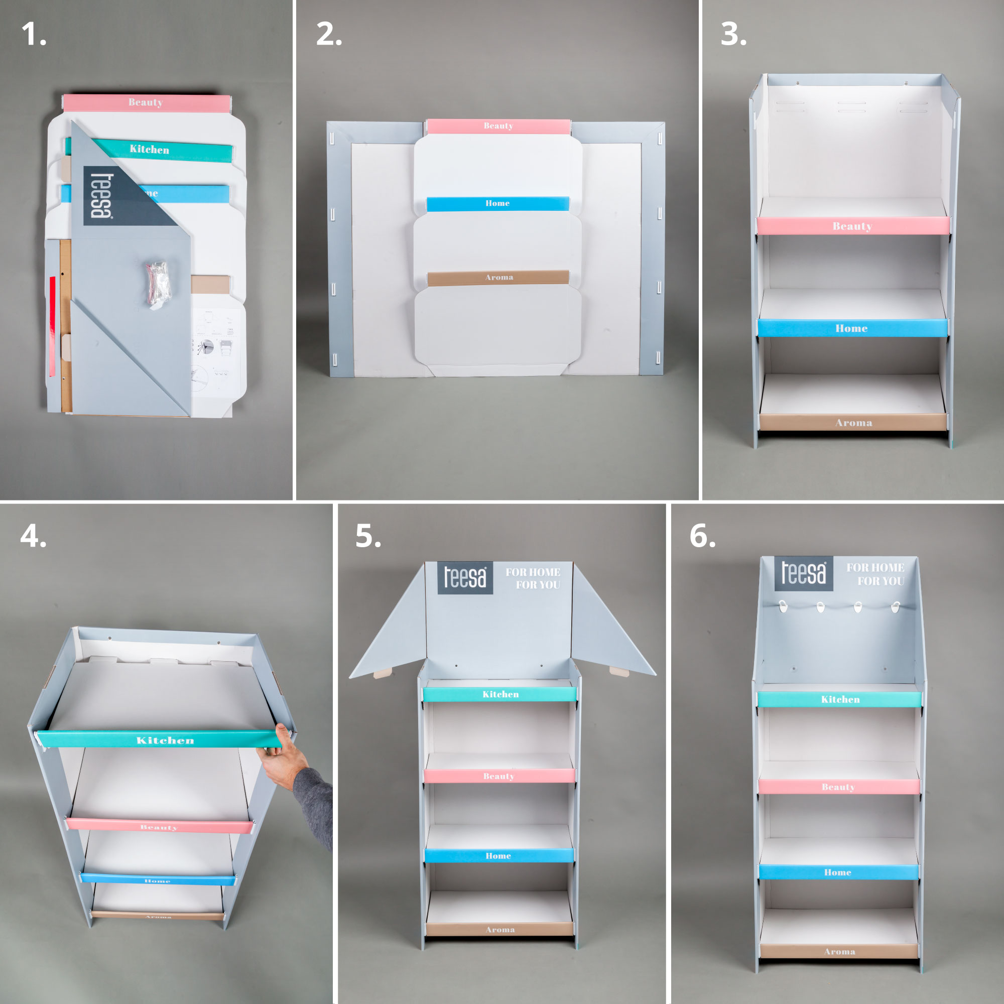 Wymiary (po rozłożeniu): 146,5 x 39,5 x 60 cmWymiary (złożony w opakowaniu): 111,5 x 70 x 7 cmWewnętrzne wymiary półek: 58 x 36 x 29 cmMateriał wykonania: tektura falistaWykończenie: folia matIlość półek: 4Maks. obciążen
