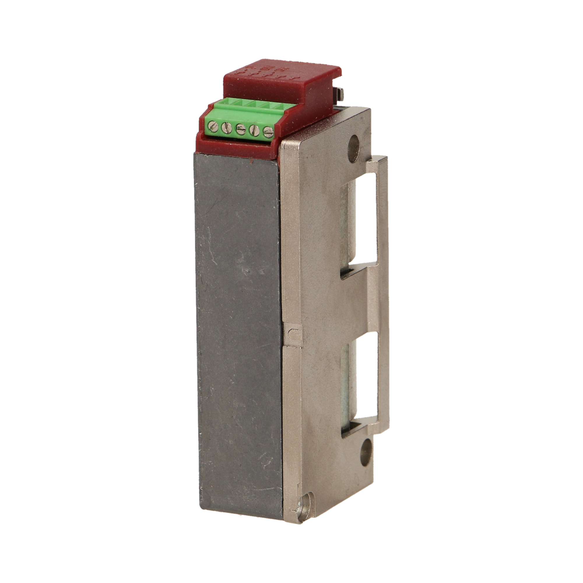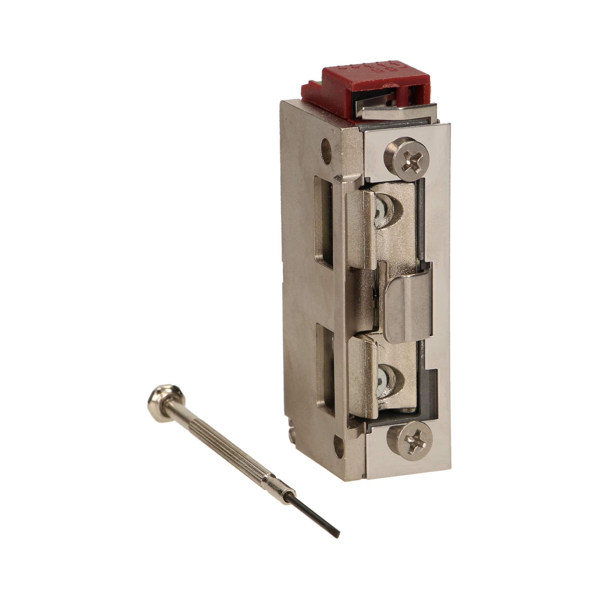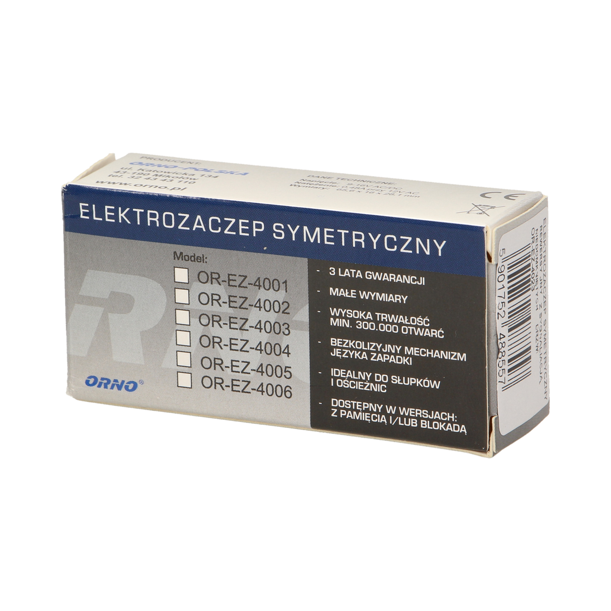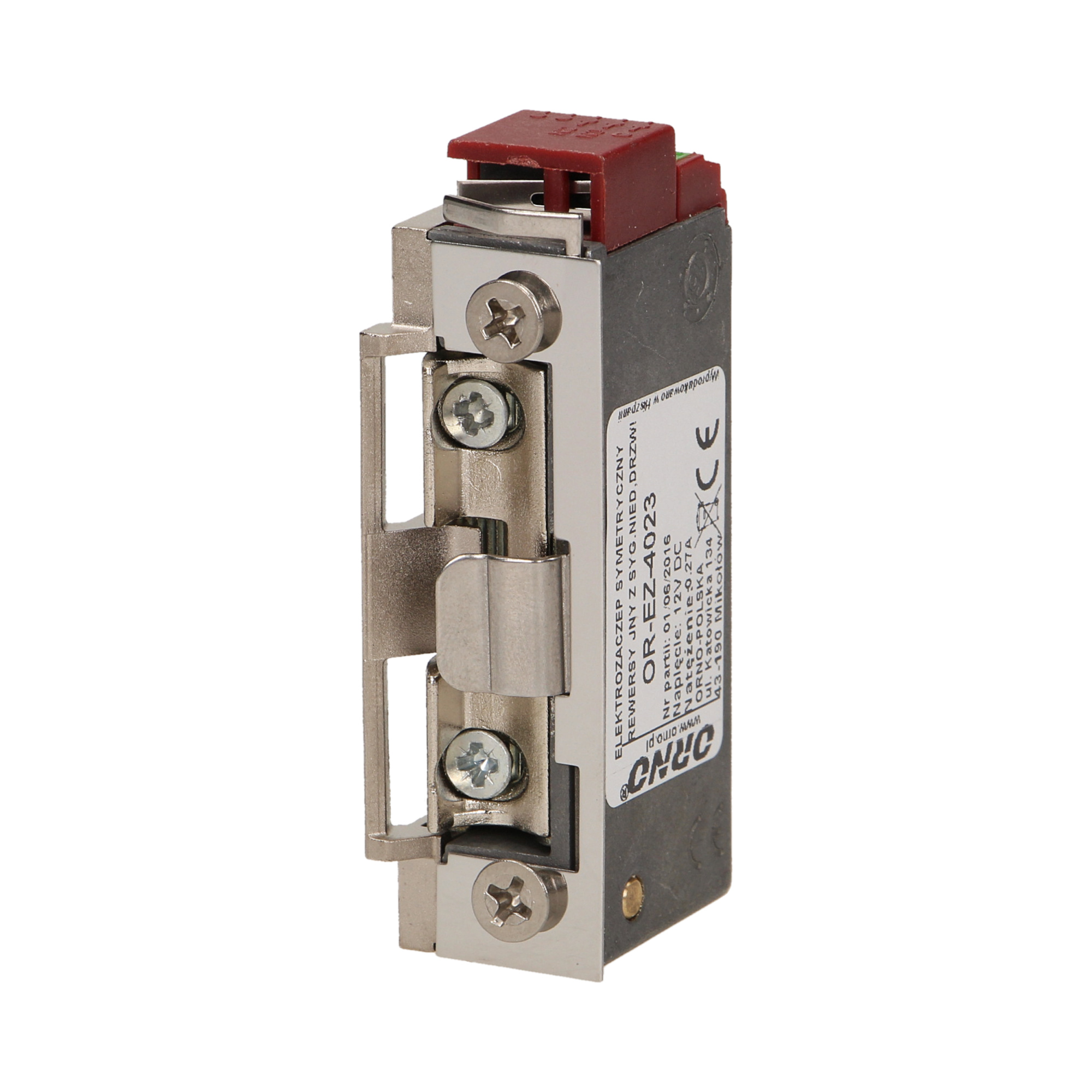 Elektrozaczep symetryczny, małogabarytowy OR-EZ-4023. Działanie jego polega na ciągłym podawaniu napięcia, powodującym blokadę zaczepu. Wyposażony jest w mikrostyk, za pomocą którego możemy sterować syreną lub sygnalizatorem, który może sygnalizować