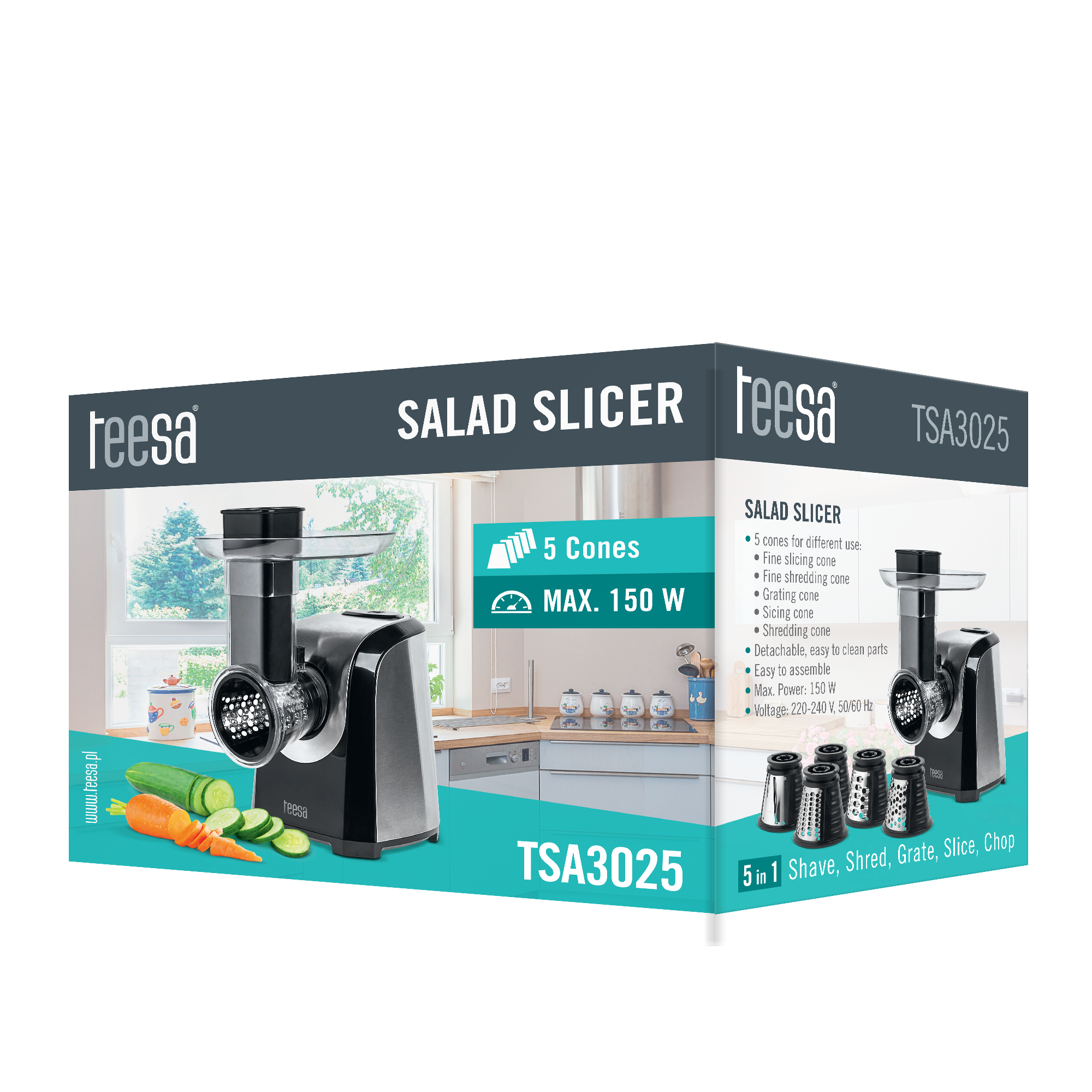 Elektryczna szatkownica do warzyw Teesa TSA3025Szatkownica do warzyw TSA3025 z silnikiem o mocy maksymalnej 150 W oraz pięcioma rodzajami tarek, pozwoli przygotować przecier lub też pokroić warzywa i owoce w równe plasterki i słupki be