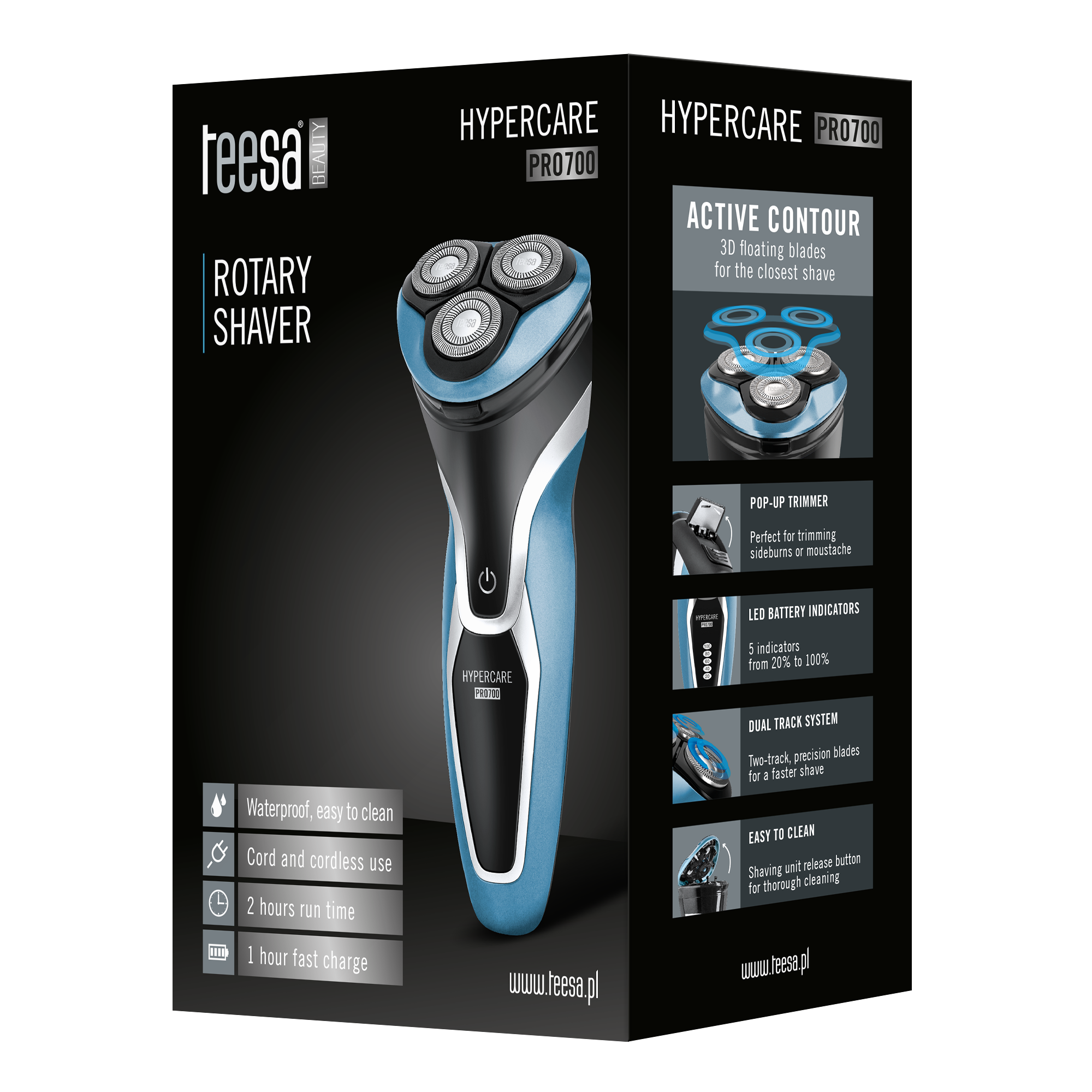 HYPERCARE PRO700Chcesz, aby Twoja twarz wyglądała zawsze świeżo i zdrowo? Zapomnij o podrażniających skórę maszynkach jednorazowych i już dziś wypróbuj rotacyjną golarkę Teesa HYPERCARE PRO700. Specjalna konstrukcja spra