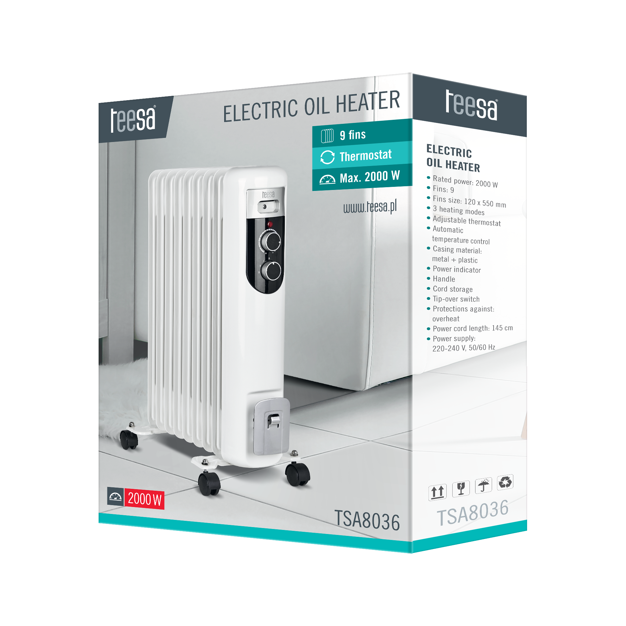 Grzejnik olejowy Teesa TSA8036Niskie temperatury w domu podczas chłodnych jesiennych dni to już tylko wspomnienie. 9-żeberkowy grzejnik olejowy Teesa o mocy 2000 W zapewni Ci ciepłe chwile w domowym zaciszu.Urządzenie posiada trzy tryby grzania, dzię