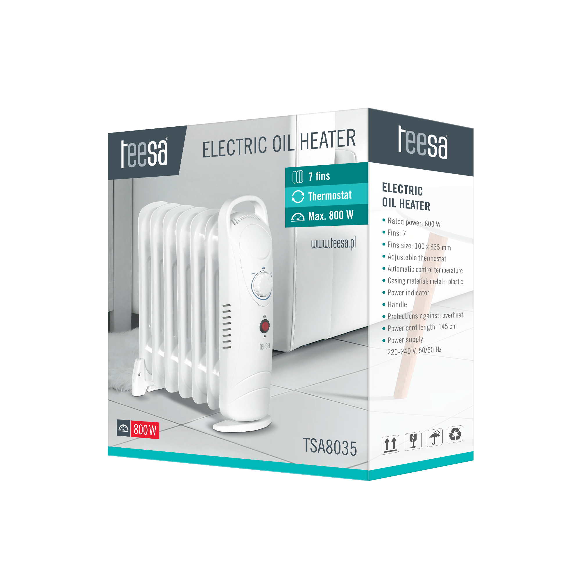 Grzejnik olejowy Teesa TSA8035Za oknem zimno, a Ty siedzisz otulona kocem, w oczekiwaniu na sezon grzewczy? To koniec zimnych wieczorów i zmarzniętych rąk! Dzięki 7-żeberkowemu grzejnikowi olejowemu Teesa o mocy 800 W w ciągu kilku chw