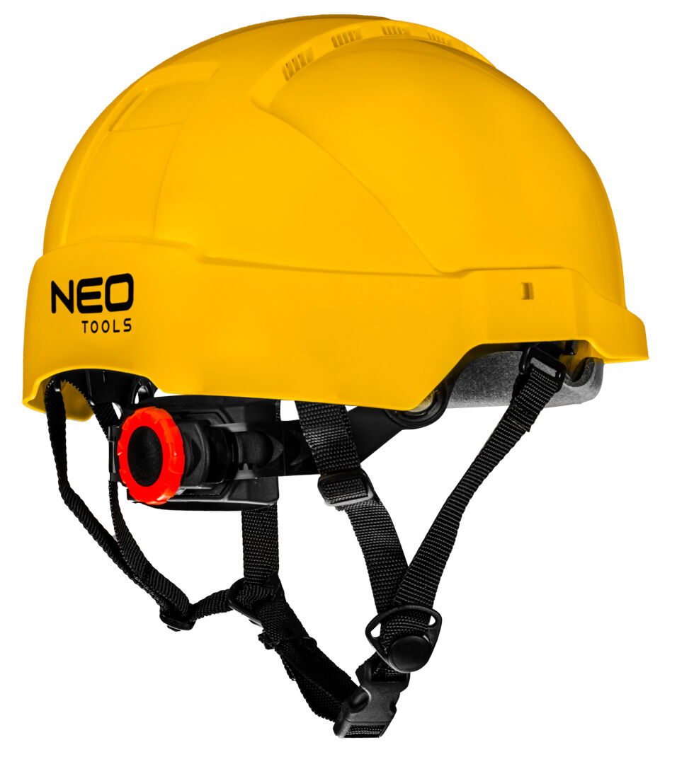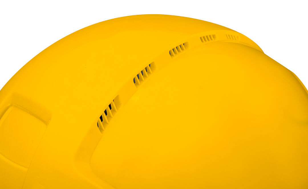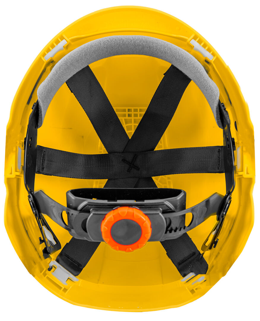 Hełm przemysłowy do pracy na wysokościach, żółty, regulowany obwód 51-63cm, materiał: ABS, uprząż 6-punktowa, 4-punktowy pasek podbródkowy, waga: 430g, chroni przed uderzeniami przedmiotów takich jak kamienie, dachówka, cegły i inne podobne przedmiot