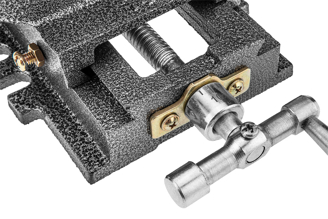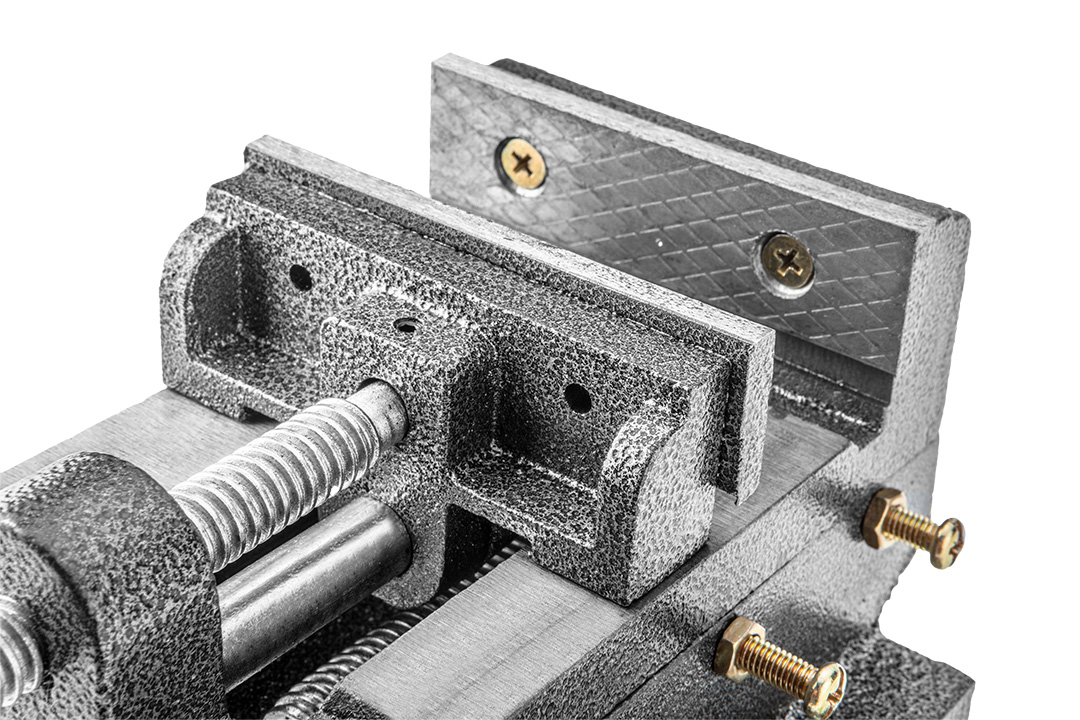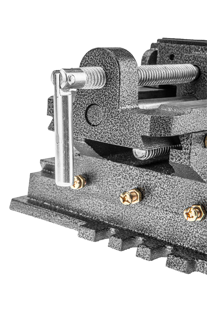 Imadło maszynowe krzyżowe dwuosiowe 100 mm, z kowadłem. Korpus wykonany z żeliwa, szczęki hartowane wykonane ze stali.