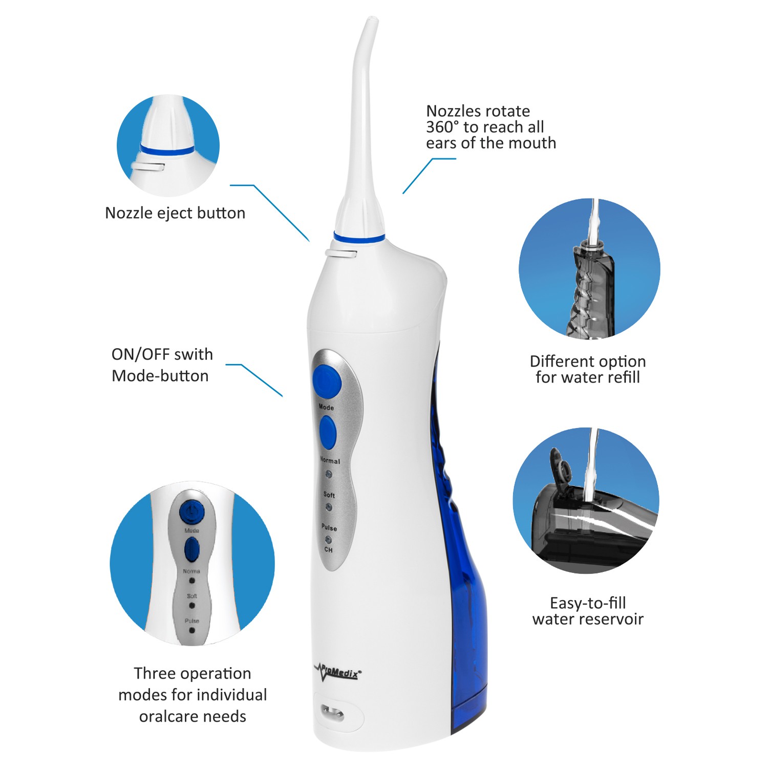 PR-770 to nowoczesny irygator bezprzewodowy, którego silny strumień wody precyzyjnie usuwa resztki pokarmu z przestrzeni międzyzębowych, utrzymując higienę jamy ustnej. Silny strumień o sile do 8,5 Bar eliminuje problem z niedoczyszczeniem aparatów o