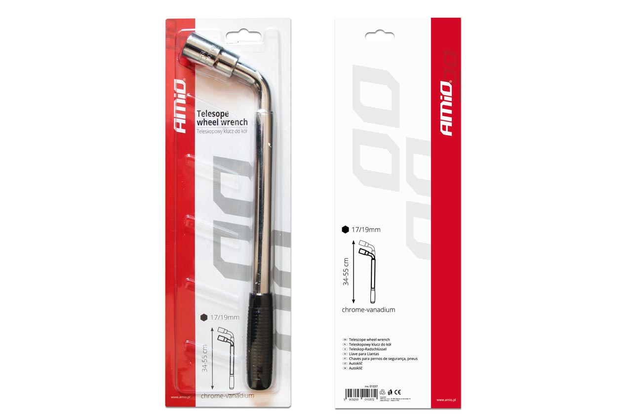 Teleskopowy klucz do kół o zmiennej długości 34-55 cm i dużej antypoślizgowej rączce. Rozmiar: 17 / 19 mm. Stal Chrom - Vanadium użyta do produkcji kluczy zapewnia wysoką jakość i wytrzymałość.