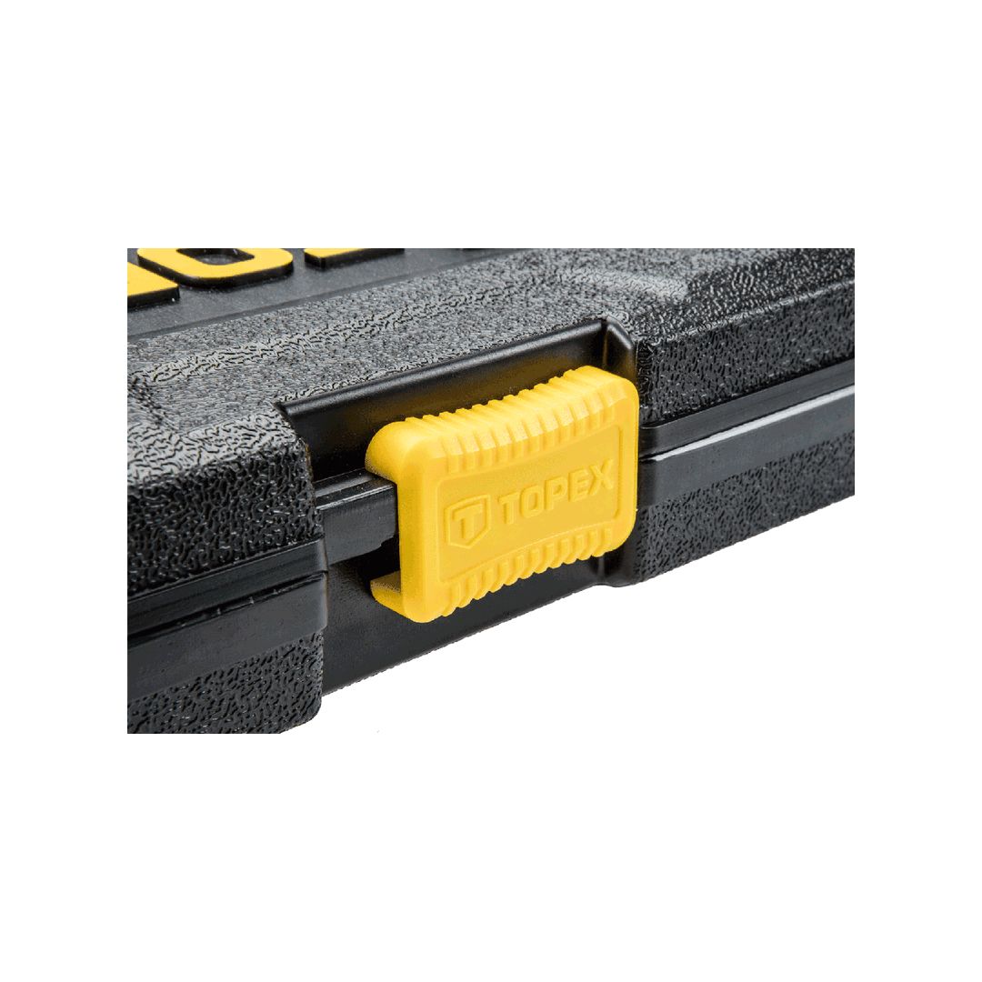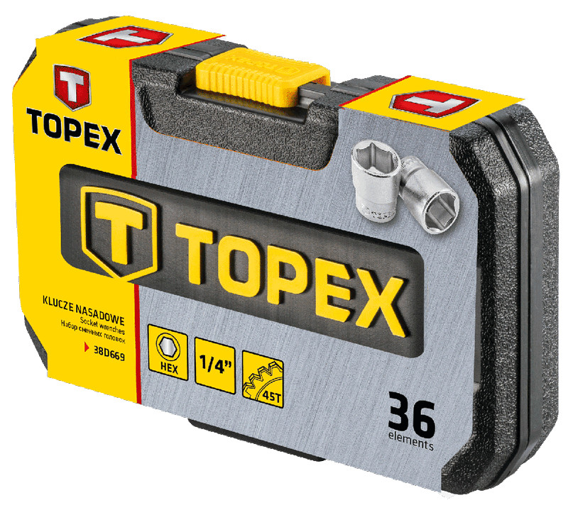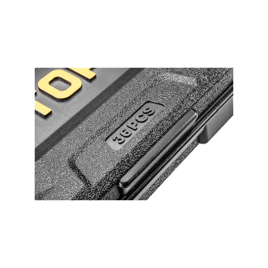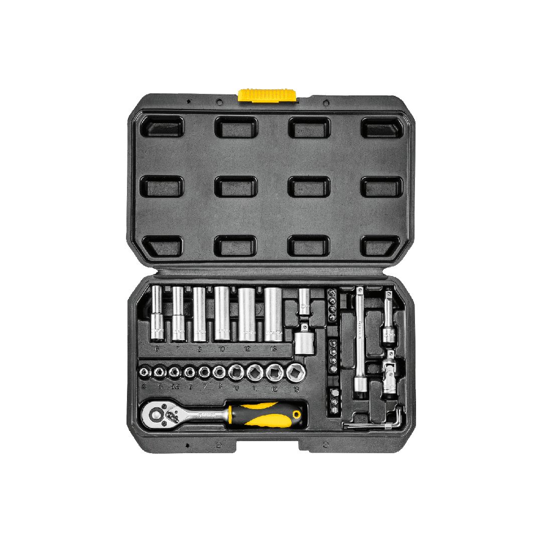 Klucze nasadowe 1/4", zestaw 36 szt., grzechotka 150 mm, 45 zęby, przełącznik kierunku obrotów, przegub uniwersalny 40 mm, 2 szt. przedłużek 50, 100 mm, adapter do końcówek wkrętakowych, redukcja 1/4"M x 3/8"F, 10 szt. nasadek sześciok