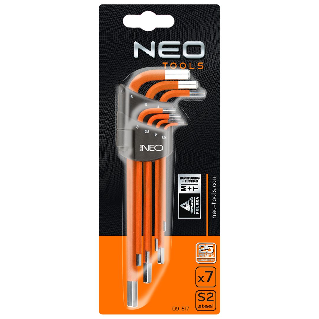 Klucze sześciokątne 1.5-6 mm, zestaw 7 szt., stal S2, DIN911, ISO2936, rozmiary: 1.5, 2, 2.5, 3, 4, 5, 6 mm, certyfikat TÜV M+T, 25 lat gwarancji