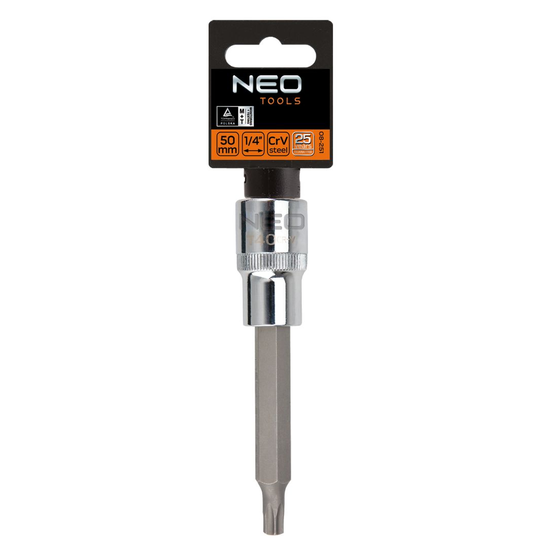 Końcówka Torx na nasadce 1/2", T25 x 100 mm, nasadka ze stali CrV, końcówka ze stali S2, certyfikat TÜV M+T, 25 lat gwarancji