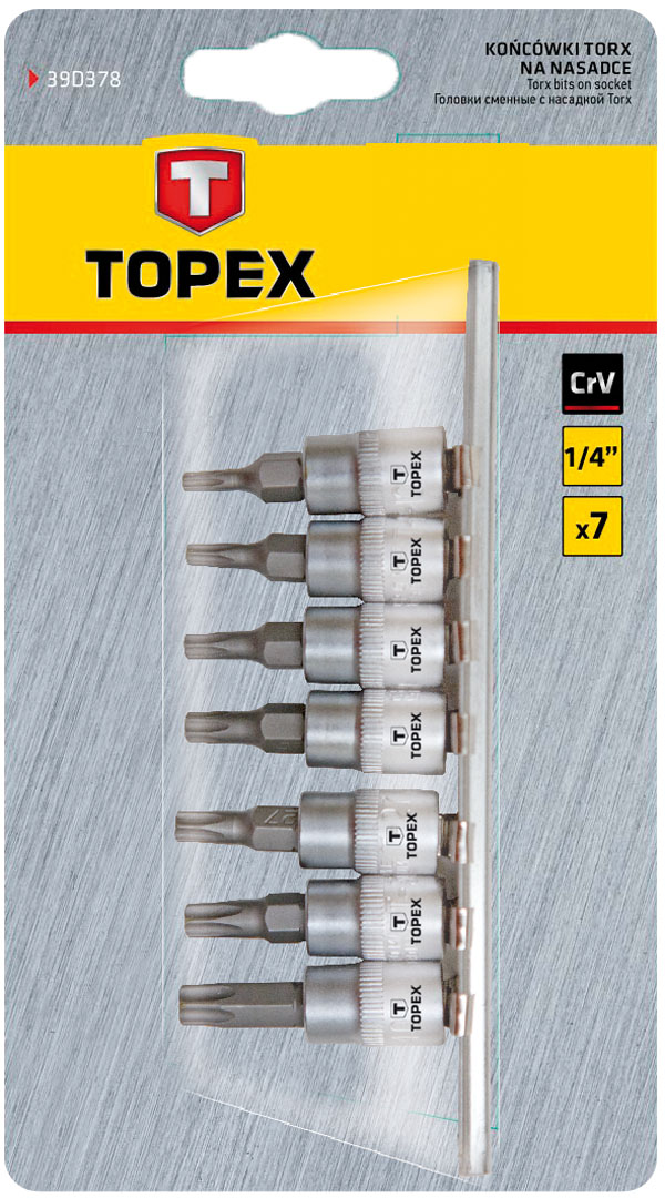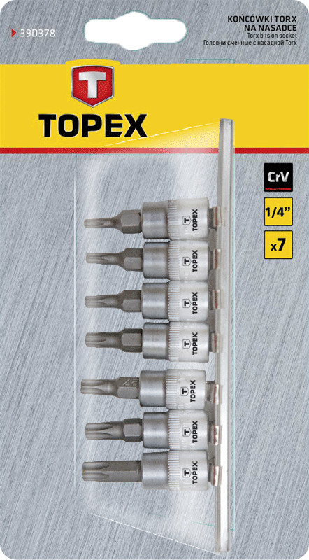 Końcówki Torx na nasadce, zestaw 7 szt., 1/4", stal CrV, rozmiary: T10, T15, T20, T25, T27, T30, T40