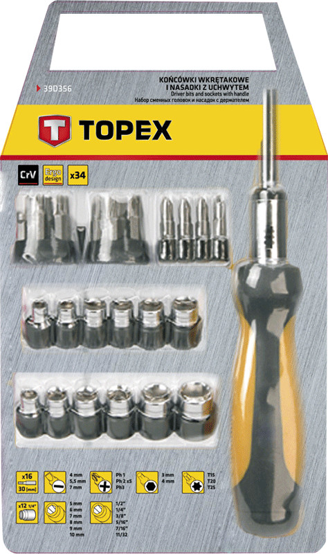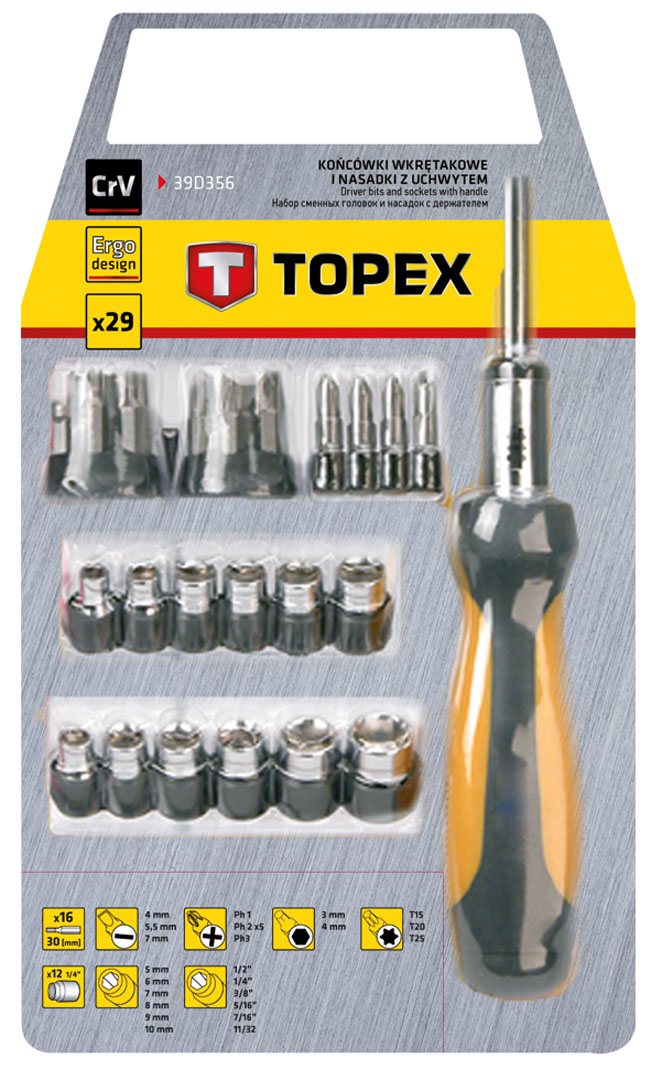 Końcówki wkrętakowe i nasadki z uchwytem, zestaw 29 szt., 1/4", uchwyt wkętakowy magnetyczny, 6 szt. nasadek metrycznych, rozmiary: 5, 6, 7, 8, 9, 10 mm, 6 szt. nasadek calowych: 1/4", 5, 16", 11, 32", 3/8", 7, 16", 1/2&
