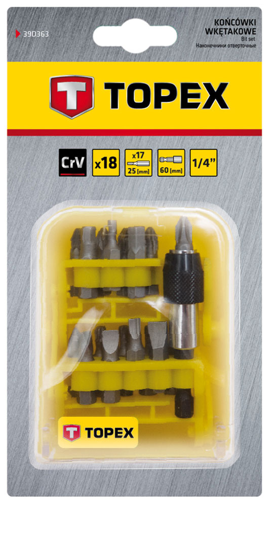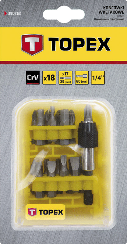 Końcówki wkrętakowe z uchwytem, zestaw 18 szt., uchwyt 1/4", 60 mm, 17 szt. końcówek wkrętakowych 25 mm, rozmiary: płaskie 4, 5, 6, 7 mm, krzyżowe PH1, PH2, PH3, PZ1, PZ2, PZ3, Torx T10, T15, T20, T25, sześciokątne H3, H5, H6, stal CrV, etui z t