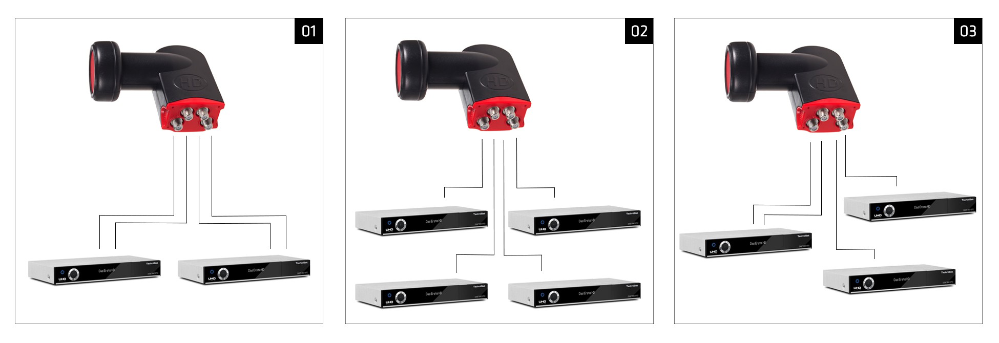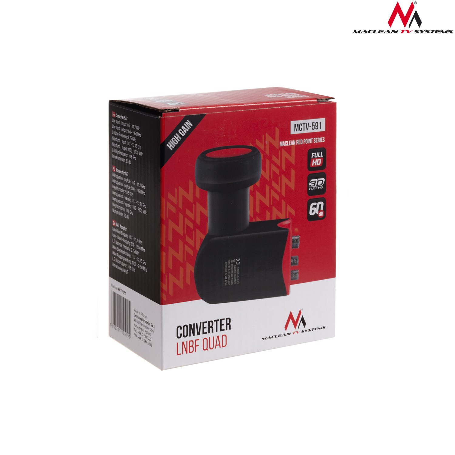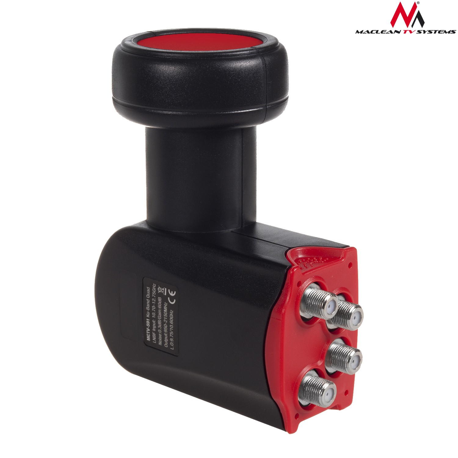 Konwerter satelitarny typu quad posiada w jednej obudowie połączone cztery pełno zakresowe konwertery. Konwerter Quad Maclean MCTV-591 jest urządzeniem klasy premium o bardzo niskim współczynniku szumów. Bez problemu radzi sobie z odbiorem sygnału HD
