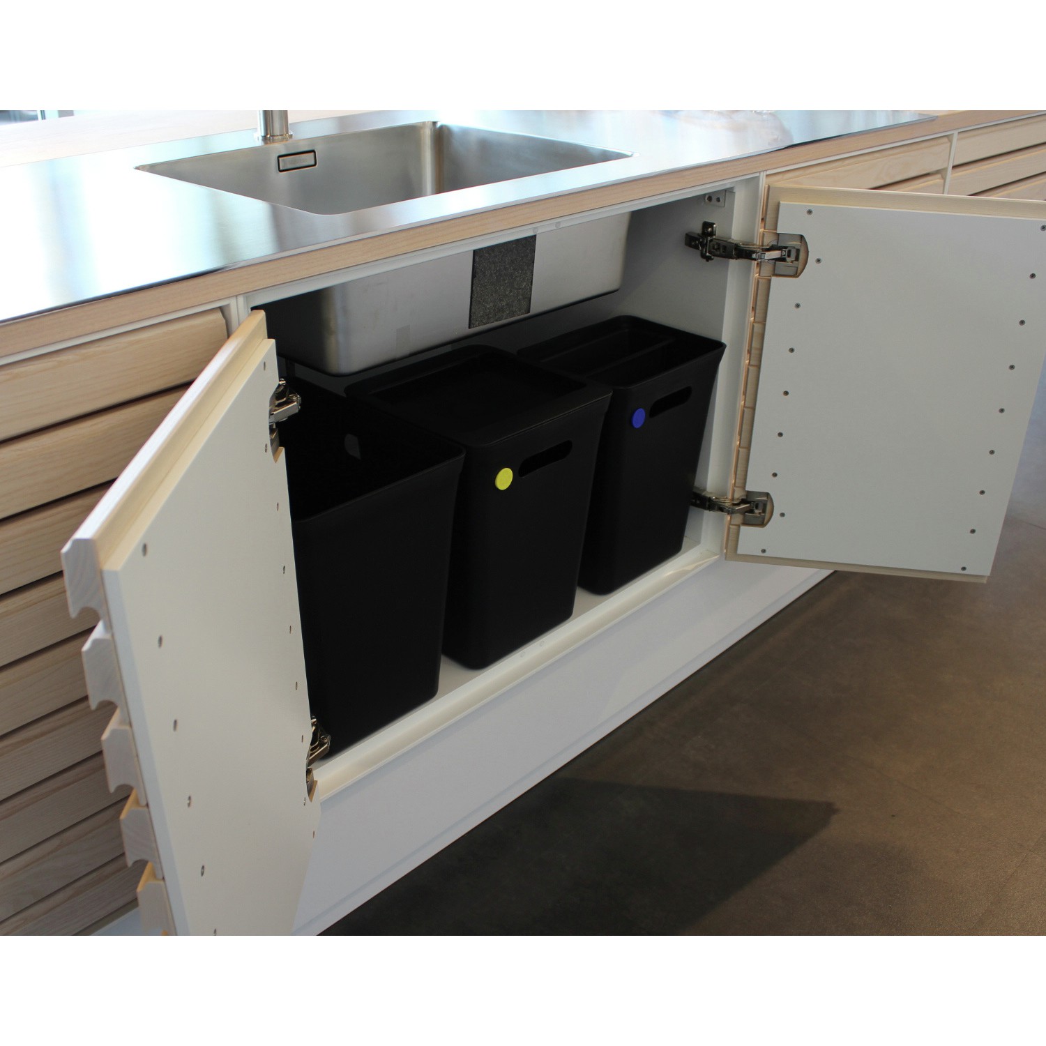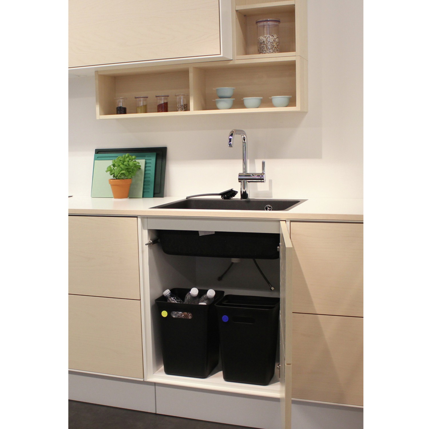Kosz na śmieci z nowoczesnej serii produktów do gospodarowania odpadami Aved?re. Wygodna rączka do przenoszenia kosza. Na frontowej ściance kosza niewielkie otwory do umieszczenia kolorowej wpinki ? jej kolor oznacza rodzaj odpadów, jakie mają być um