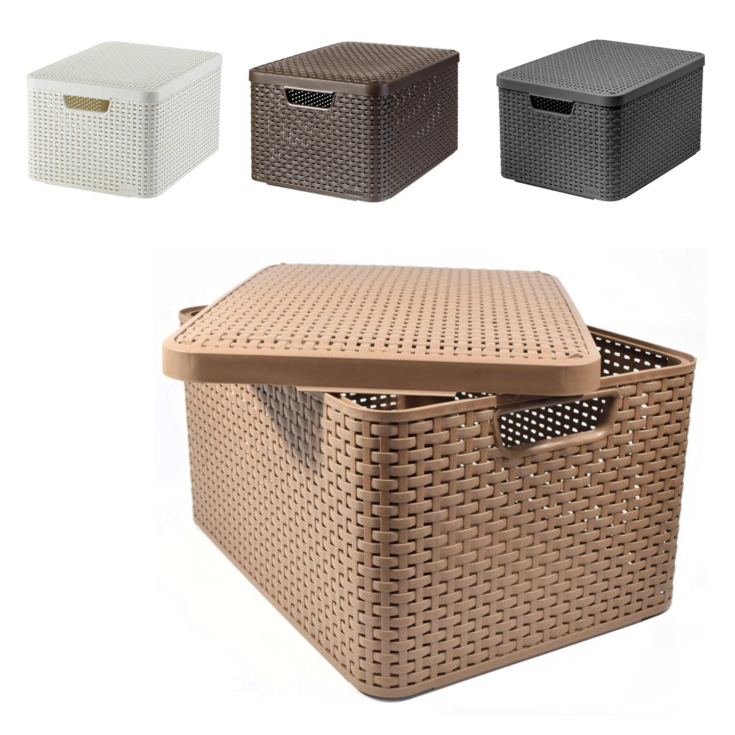 Praktyczny pojemnik do przechowywania z kolekcji Style Curver w rozmiarze L.Wygląda jak rattanowy koszyk, ale wykonany jest z lekkiego, kremowego tworzywa sztucznego.Kosz z pokrywą, dzięki nowoczesnemu designowi doskonale pasuje do różnych wnętrz: ła