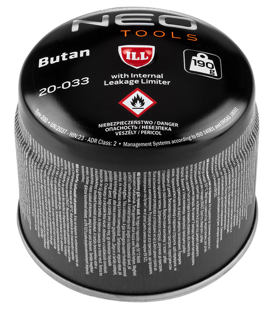 Lampa lutownicza gazowa na naboje 190 g, temperatura pracy 1350°C, moc 1.2 kW, średnie zużycie gazu 87 g/h, palnik wykonany z mosiądzu, zapłon piezo, obudowa z tworzywa, 4 Naboi z gazem butan 190g, system blokowania wypływu gazu