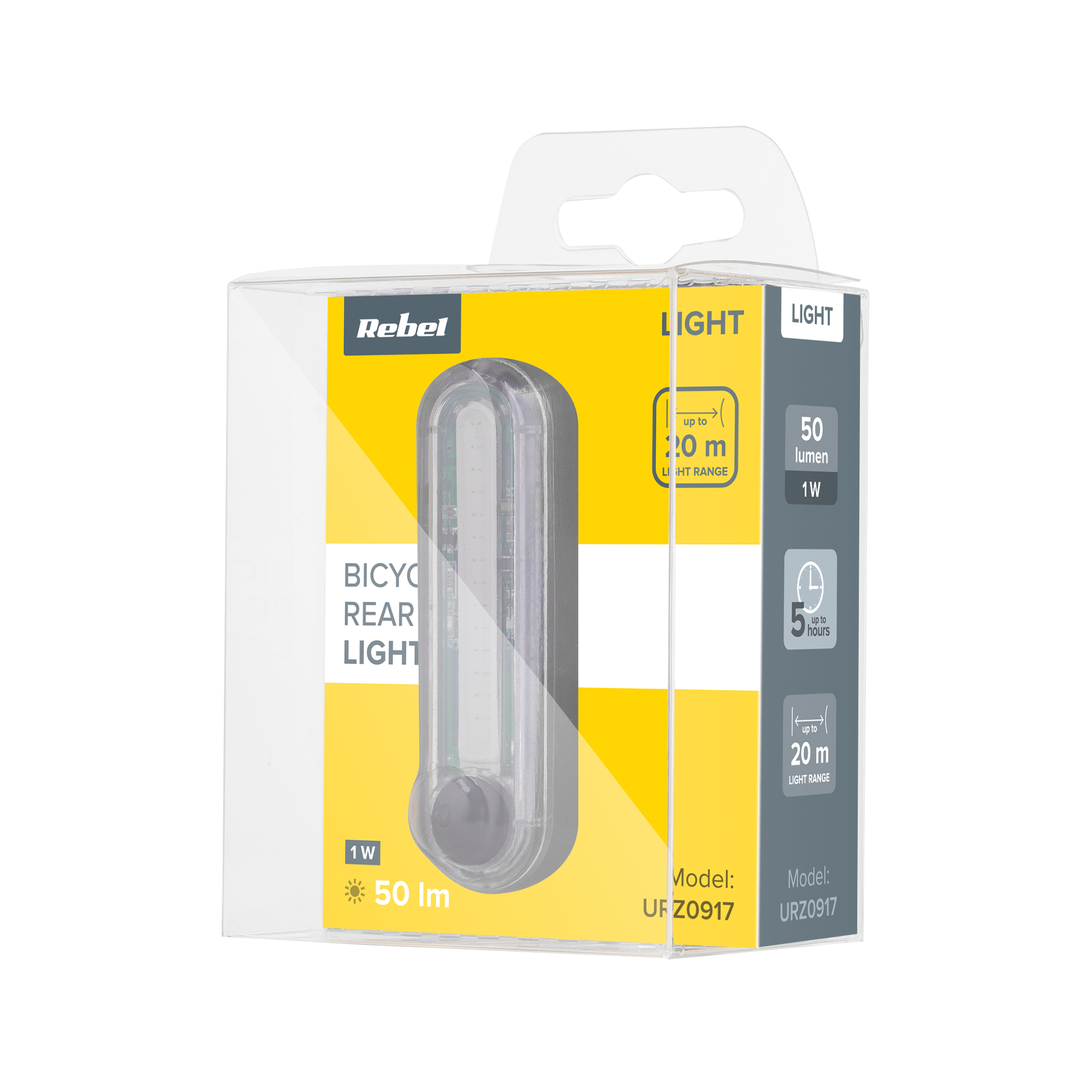 Źródło światła: 1x COB (czerwony)Tryby świecenia: światło stałe (niski/ średni/ wysoki poziom świecenia); miganie/ szybkie miganie/ stroboskopStrumień świetlny: 50 lmZasięg świecenia: 20 mCzas pracy: do 5 hCzas ładowania: do 2 hFunkcja pamięci (ostat