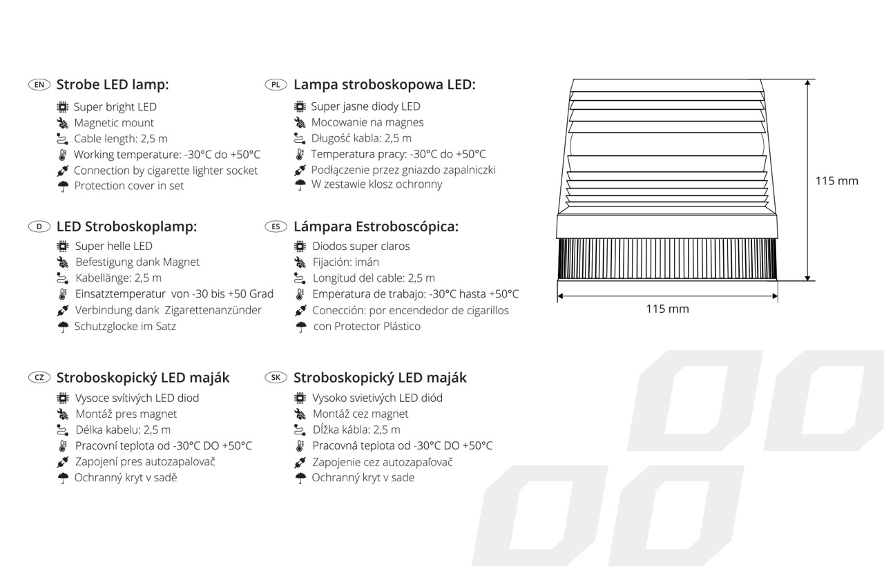 Lampa stroboskopowa LED: Super jasne diody LED Mocowanie na magnes Długość kabla: 2,5m Temperatura pracy: -30 °C do + 50°C Podłączenie przez gniazdo zapalniczki W zestawie klosz ochronny Wymiary lampy: Szerokość: 115mm Wysokość: 115mm