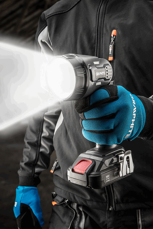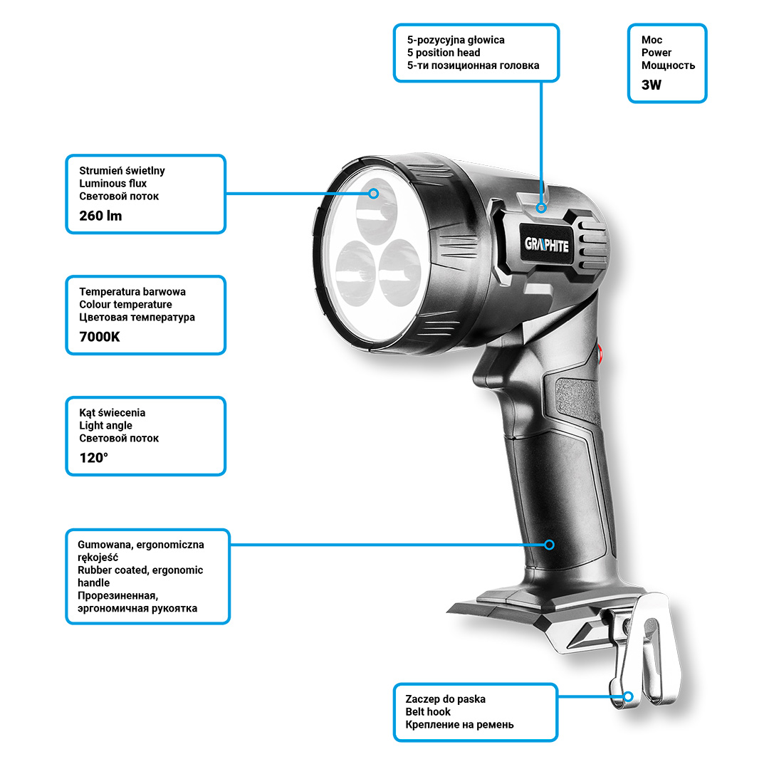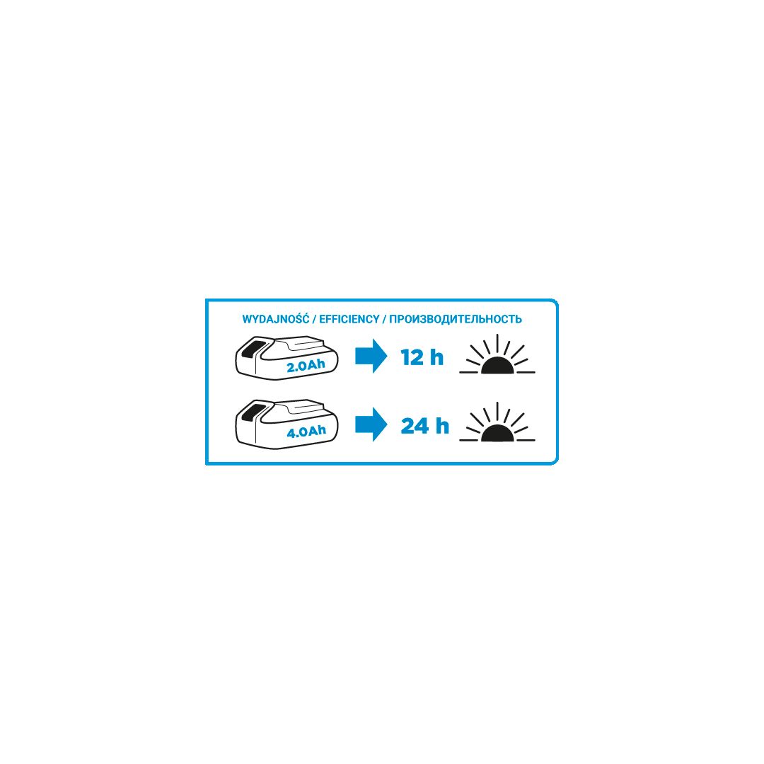 Latarka akumulatorowa 18V, Li-Ion, 3 x LED, temperatura światła 7000 K, strumień świetlny 260 lm, kąt świecenia 120 stopni, (LxH) 140 x 230 mm, masa 0.3 kg, kompatybilna z akumulatorami Energy+