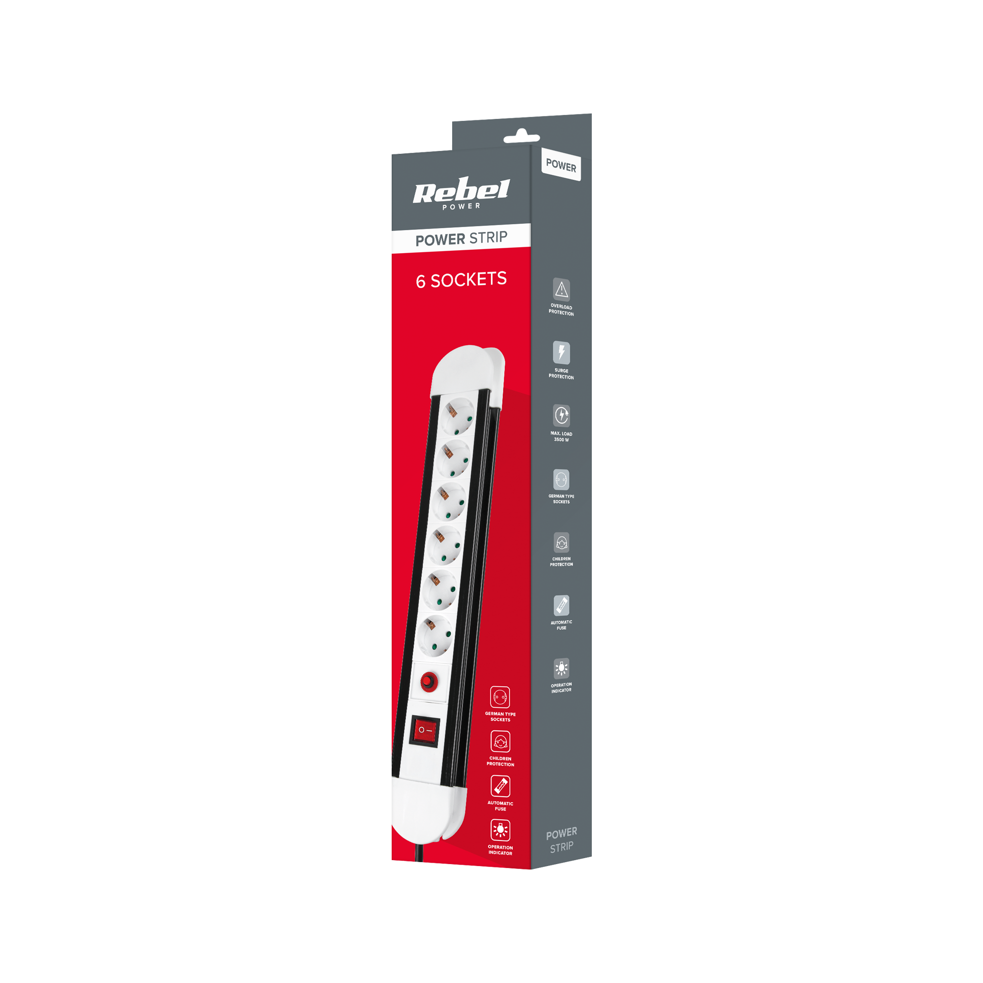 Listwa zasilająca typu niemieckiego RebelListwa sieciowa Rebel to doskonałe rozwiązanie do zastosowania np. w gospodarstwie domowym lub biurze. Sześć gniazd typu niemieckiego o maksymalnym obciążeniu 3500 W gwarantuje swobodne podłączenie niezbędnych