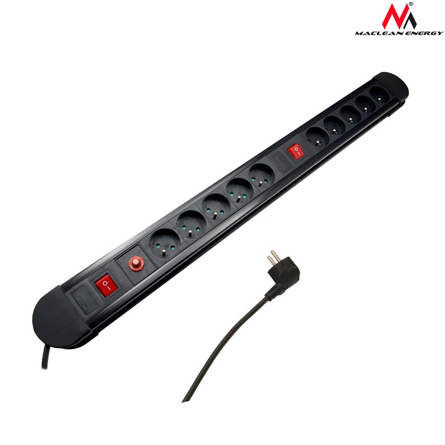Listwa zasilająca 10 gniazd z 2 włącznikami Maclean Energy MCE10 zabezpieczenie i sygnalizacja przeciążeniaWysokiej jakości listwa zasilająca, która posiada aż 10 gniazd rozdzielonych na 2 włączniki (2x5 gn.). Świetnie sprawdzi się w