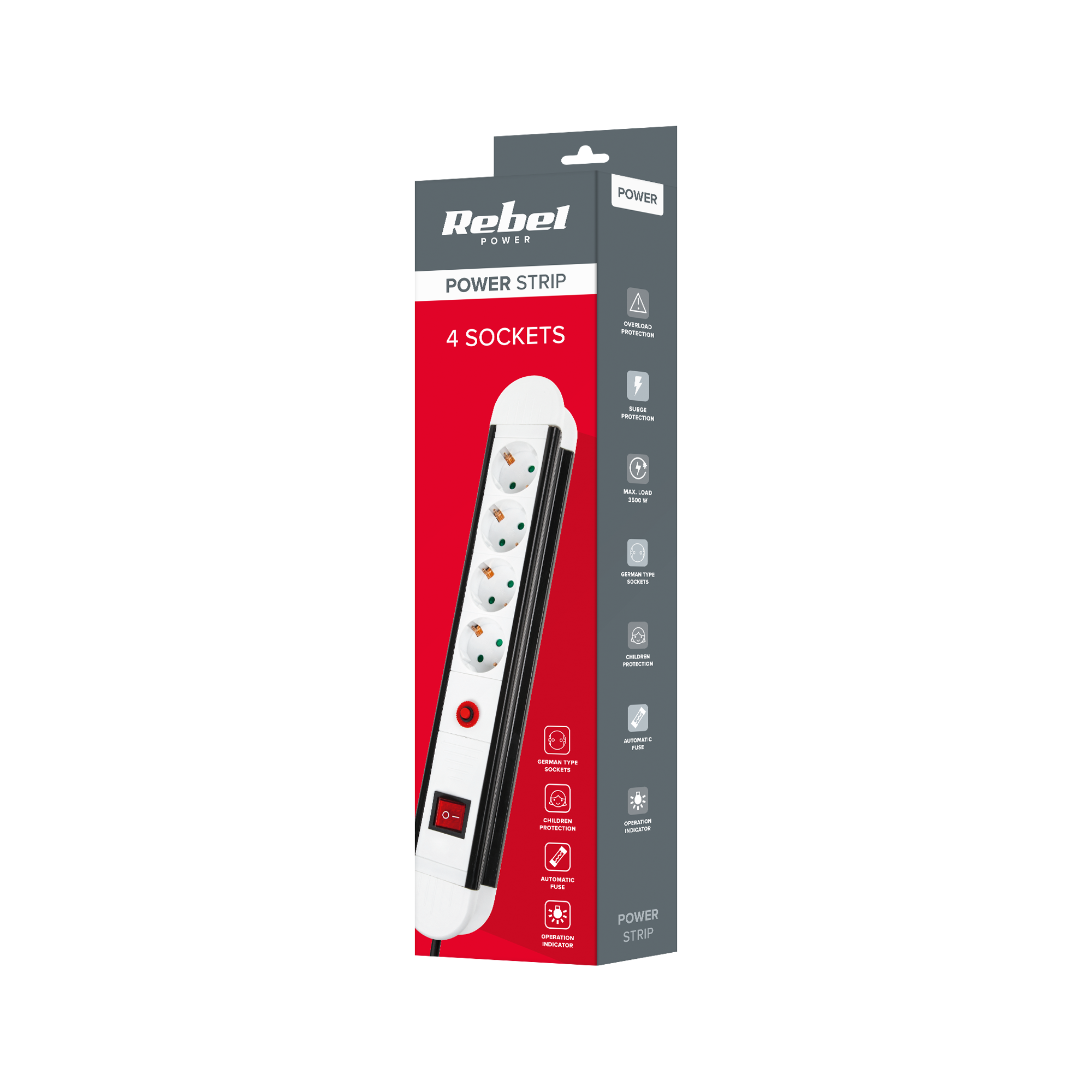 Listwa zasilająca typu niemieckiego RebelListwa sieciowa Rebel to doskonałe rozwiązanie do zastosowania np. w gospodarstwie domowym lub biurze. Cztery gniazda typu niemieckiego o maksymalnym obciążeniu 3500 W gwarantuje swobodne podłączenie niezbędny