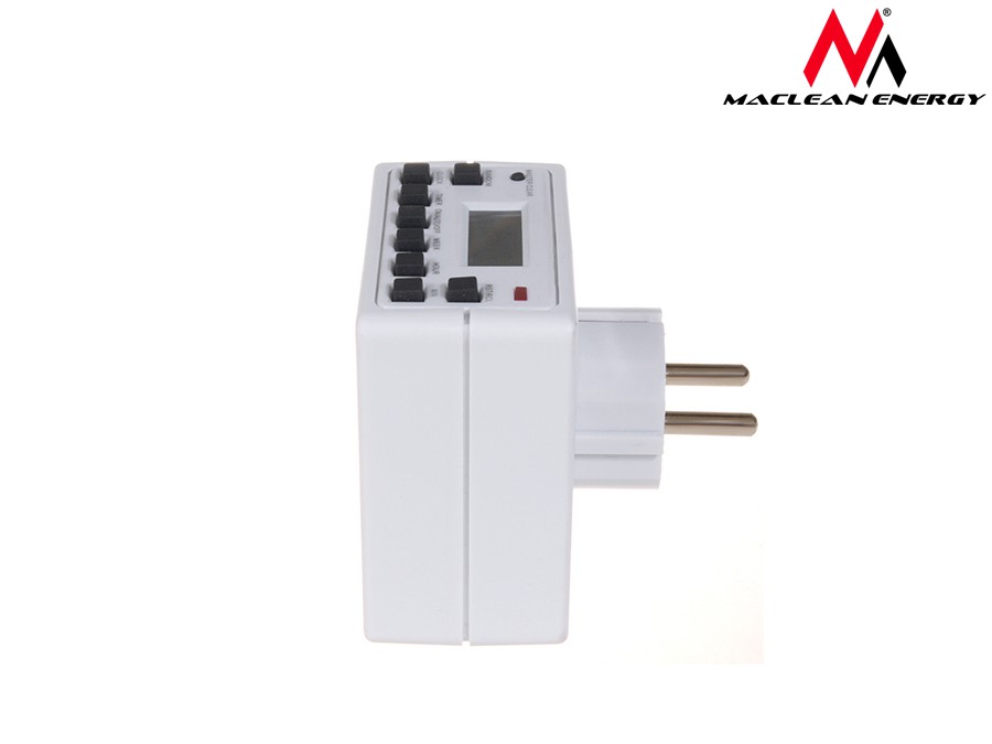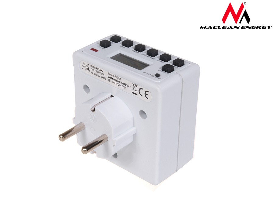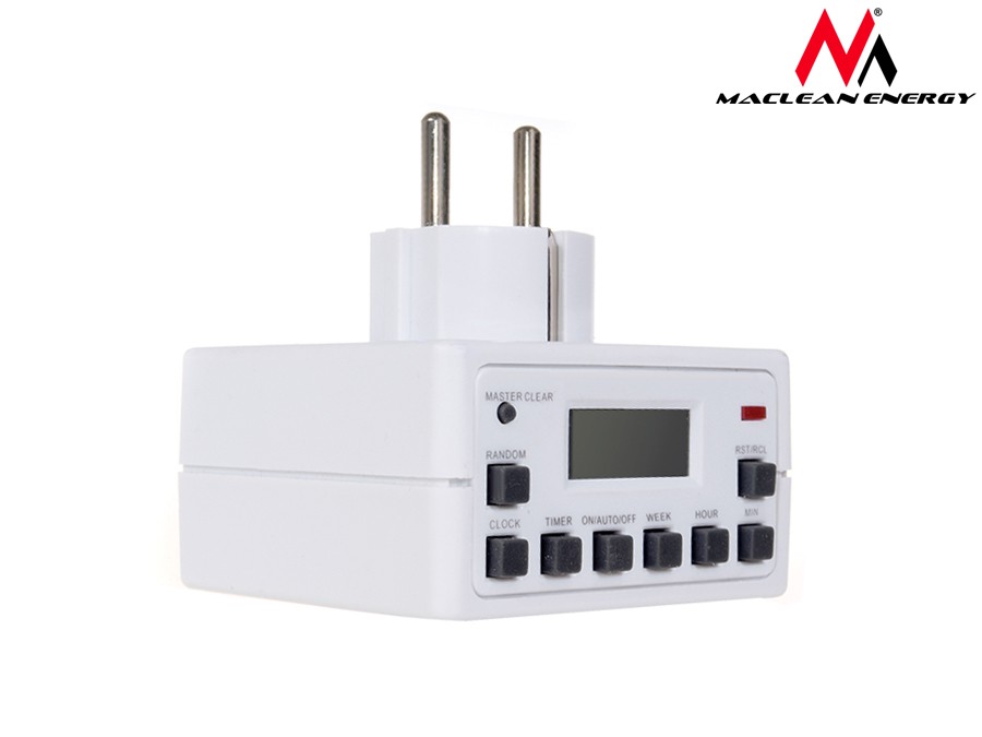 MCE30G Timer cyfrowy Maclean Energy, wersja niemieckaCyfrowy, programowalny timer - programowany włącznik / wyłącznik czasowy.Funkcje:10 programów włączenia / wyłączenia z krokiem 1 minutowymręczne włączanie / wyłączanielosowe włączani