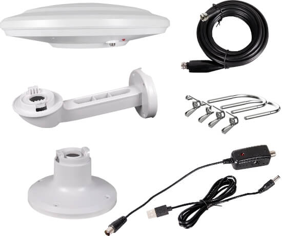 Antena może być zasilana bezpośrednio z gniazda RF telewizora (jeżeli odbiornik posiada taką funkcję) lub z gniazda USB telewizora."zero" zbędnych kabli w kabinie (nie wymaga dodatkowego zasilania z gniazda 12V)4 metry bieżą