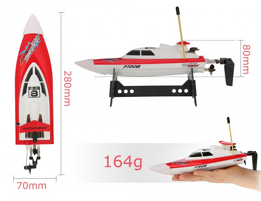 FT008 to szybka, łatwa i przyjemna w użyciu motorówka na zdalne sterowanie. Łódka przy odpowiednim uszczelnieniu kadłuba i poprawnym zamknięciu pokrywy jest praktycznie niezatapialna. W razie wywrotki wystarczy tylko dodać gazu, aby motorówka powróci