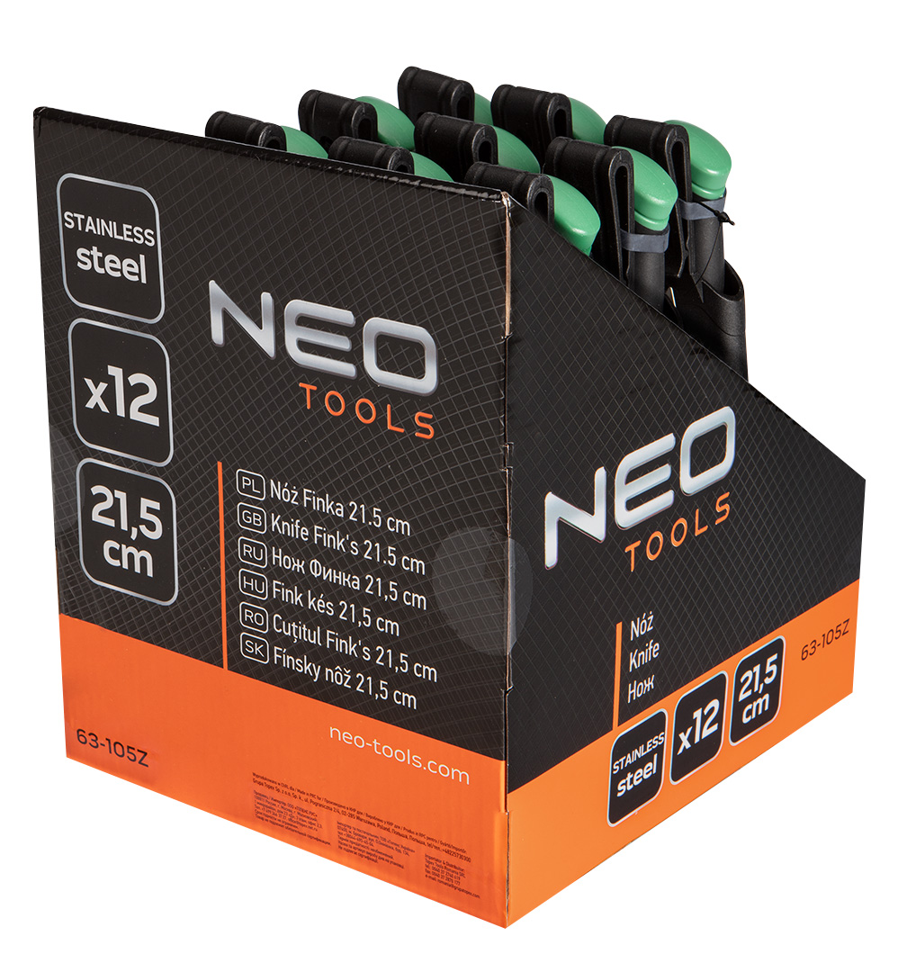 Nóż Finka 21.5 cm, stal 3Cr13, ostrze 9.5 cm, uchwyt PP+TPR, plastikowy pouch z zaczepem na pasek, display 12 szt.