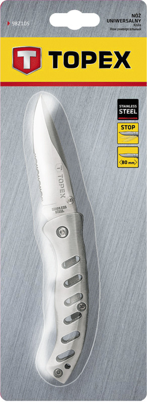 Nóż uniwersalny, ostrze 80 mm, składany, nierdzewne ostrze, metalowy korpus, blokada ostrza, zaczep na pasek