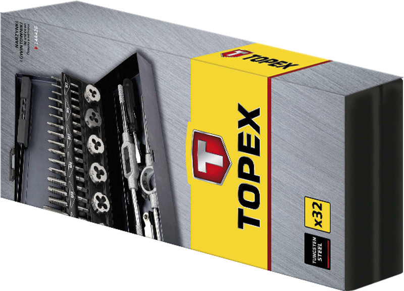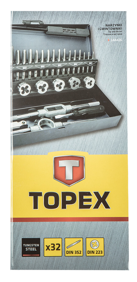 Narzynki i gwintowniki M3-M12, zestaw 32 szt., stal wolframowa, DIN352 / DIN233, metalowa kaseta do przechowywania, przymiar do gwintów, wkrętak do mocowania narzynek