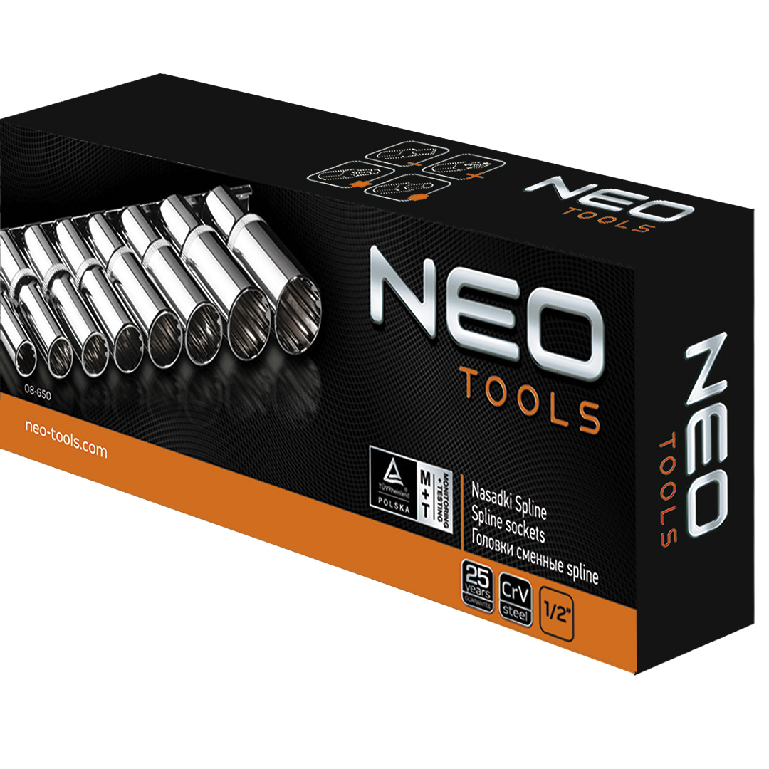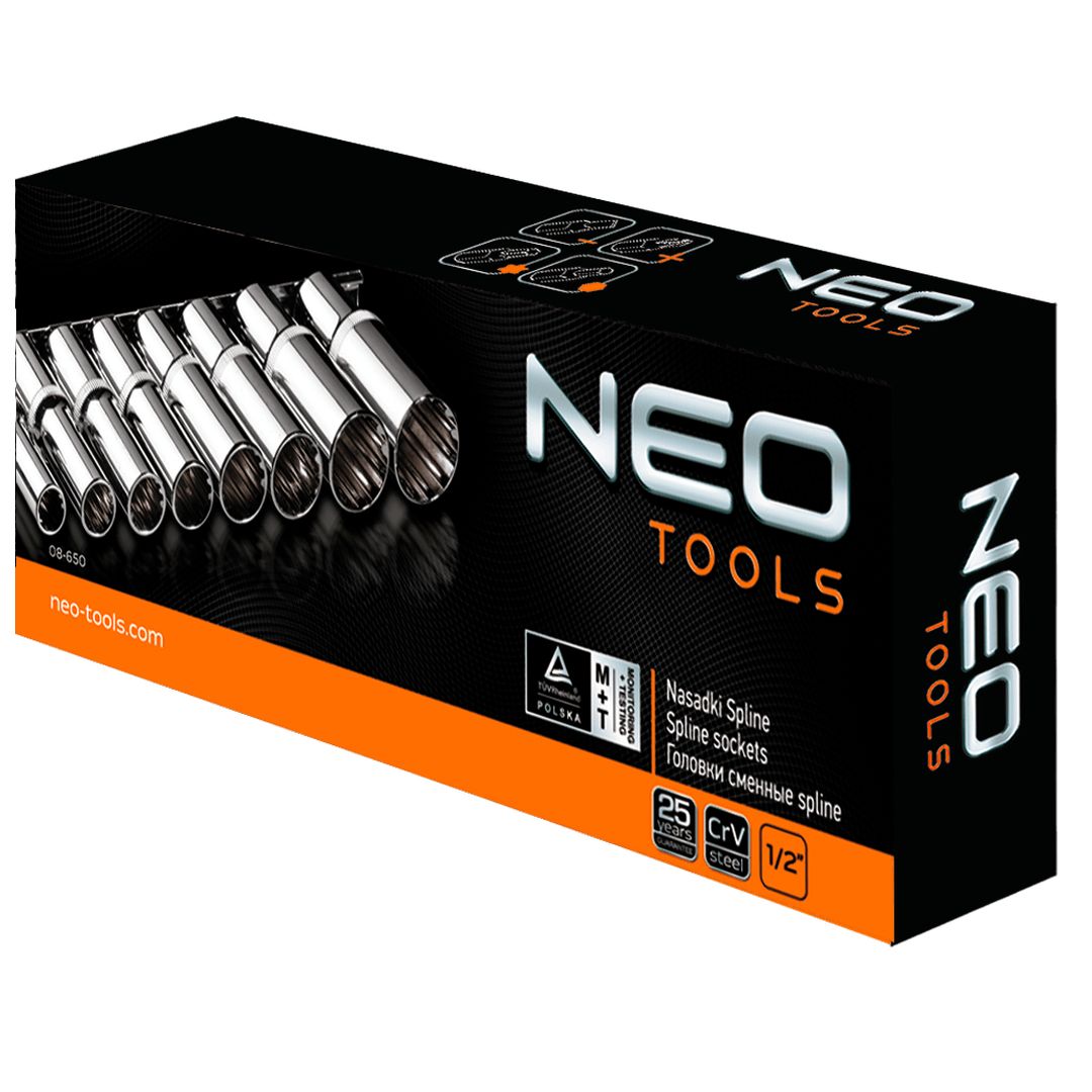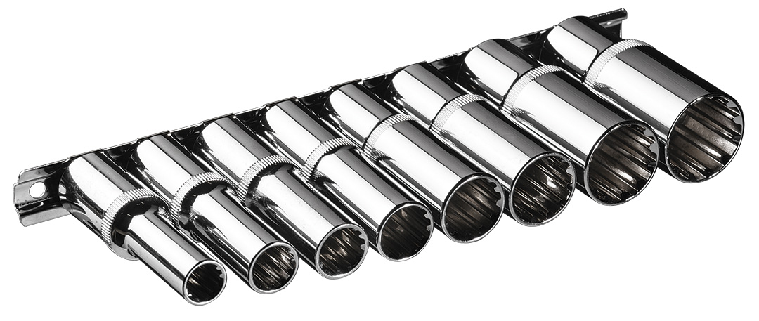 Nasadki Spline długie 1/2", zestaw 8 szt., sferyczny kształt pasujący do śrub sześciokątnych metrycznych i calowych, dwunastokątnych, kwadratowych, Torx, Spline, stal CrV, rozmiary: 10, 12, 13, 15, 17, 19, 22, 24 mm, certyfikat TÜV M+T, 25 lat g