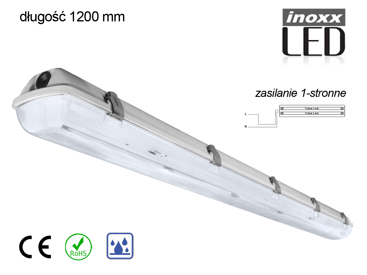 nowoczesna oprawa przemysłowa do montażu natynkowego dla 2. świetlówek T8 z trzonkiem G13 120cm jednostronnie zasilanychlampa hermetyczna o poziomie szczelności IP65, posiada dodatkową uszczelkę zabezpieczającą przed wilgociąsolidne wykonanie lampy p