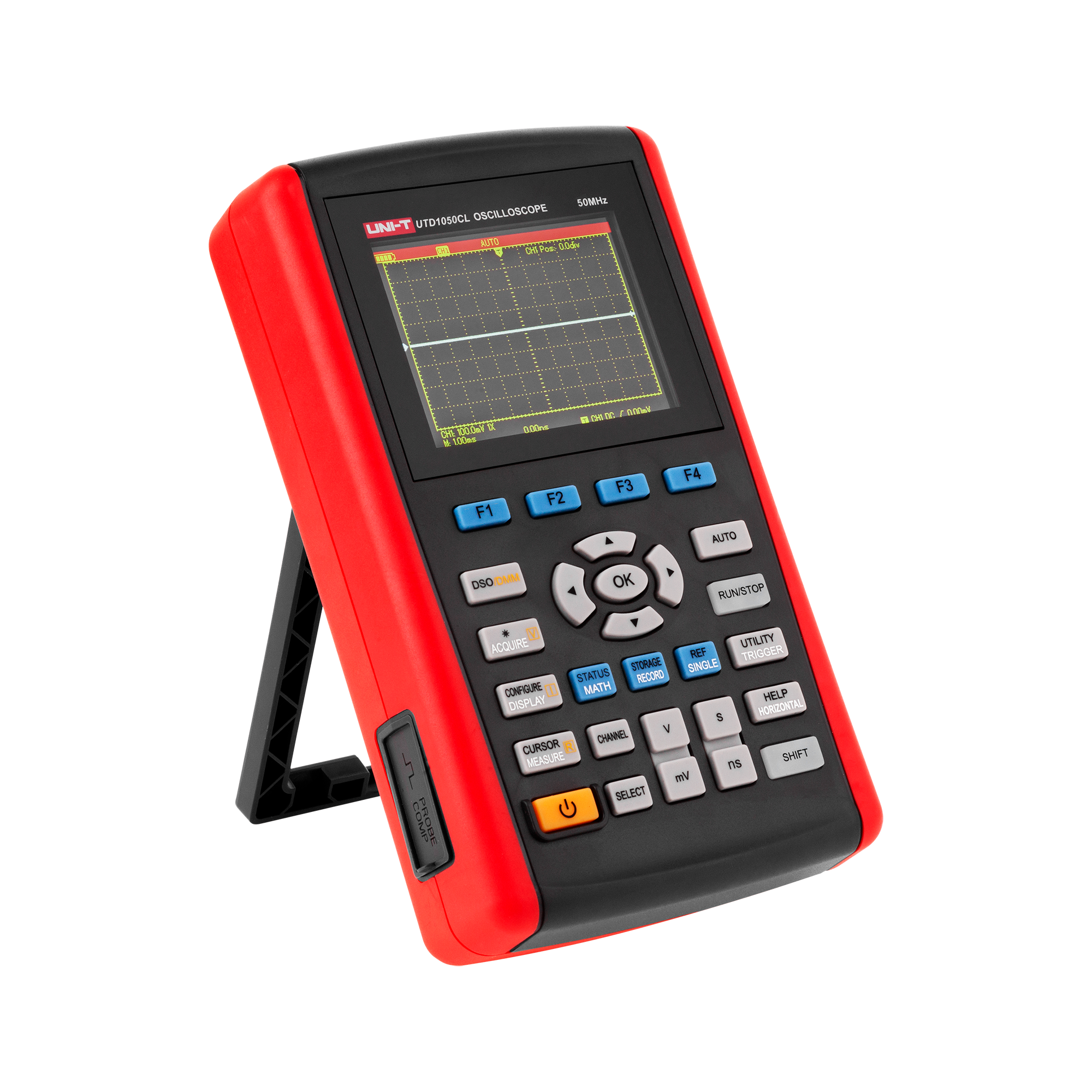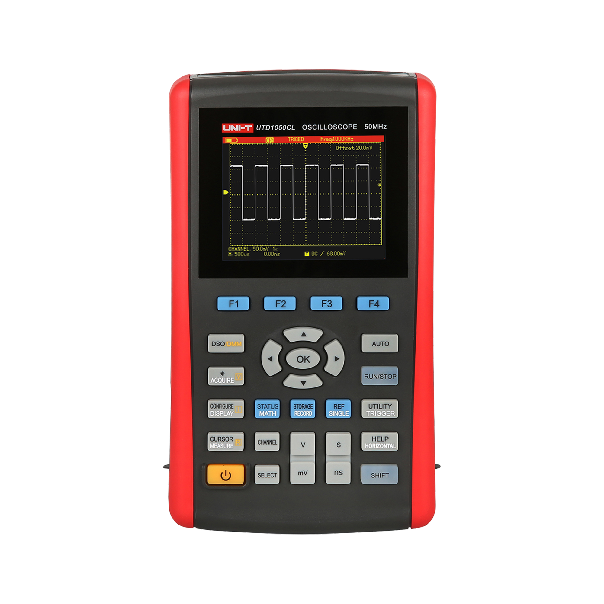 UTD1050CL to kieszonkowy oscyloskop cyfrowy 50MHz oraz multimetr w jednym. Zaletą urządzenia jest kolorowy wyświetlacz LCD o dużym kontraście. Dzięki wyświetlaniu 3999 możliwe są zapisy pomiarów szerokiego zakresu napięć - aż do 200V/d