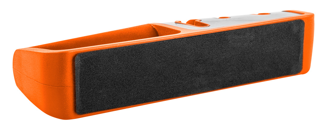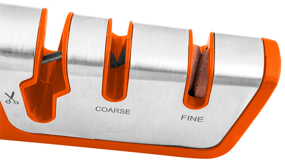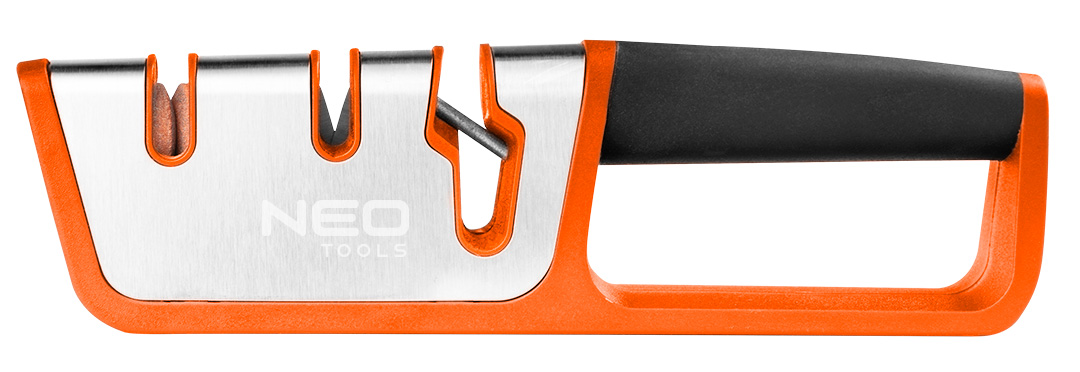 Ostrzałka do noży i nożyczek, obudowa wykona z odpornego na uderzenia tworzywa ABS, częściowo pokryta gumą TPR oraz stalą nierdzewną. Dwustopniowe ostrzenie noży: wstępne i nadające kształt ostrza - z węglika wolframu oraz polerujące - ceramiczne. Sp