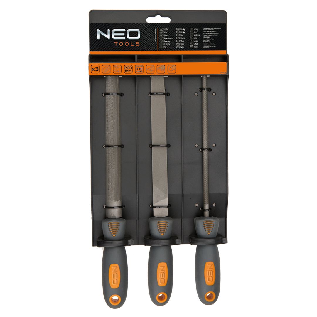 Pilniki do metalu, zestaw 3 szt., płaski, półokrągły, okrągły, uchwyt dwumateriałowy, stal T12, gradacja 2