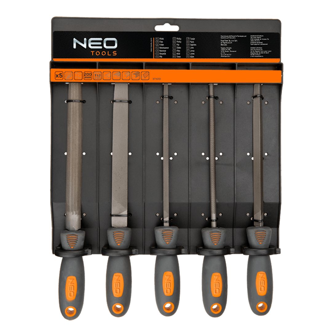 Pilniki do metalu, zestaw 5 szt., płaski, półokrągły, okrągły, kwadratowy, trójkątny, uchwyt dwumateriałowy, stal T12, gradacja 2