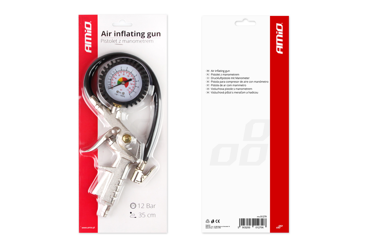 Pistolet służy do pompowania kół o standardowych wentylkach samochodowych. Barometr jest osłonięty pofałdowaną gumą, która chroni go przed uszkodzeniem podczas nieostrożnego odkładania. Pistolet wyposażony jest w standardowe szybko złącze męskie stos