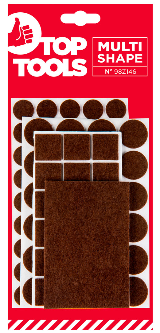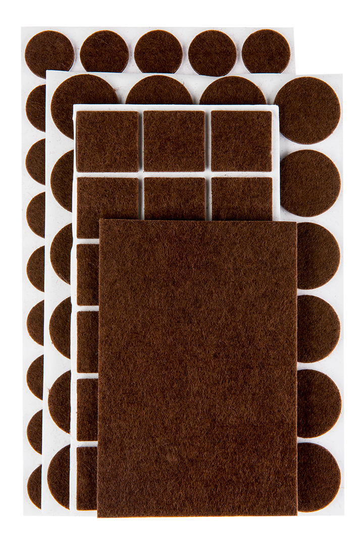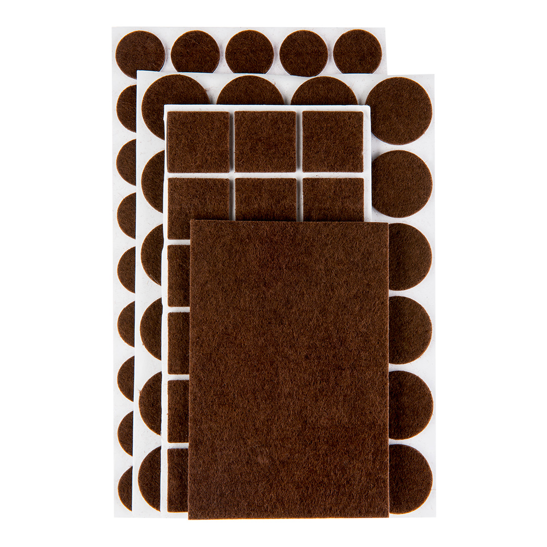 Podkładki filcowe samoprzylepne, brązowe, 106 szt., 3 mm grubości, 45 x okrągłe, średnica 20 mm, 24 x okrągłe, średnica 28 mm, 36 x kwadratowe 25 mm, 1 x prostokątne 80 x 120 mm