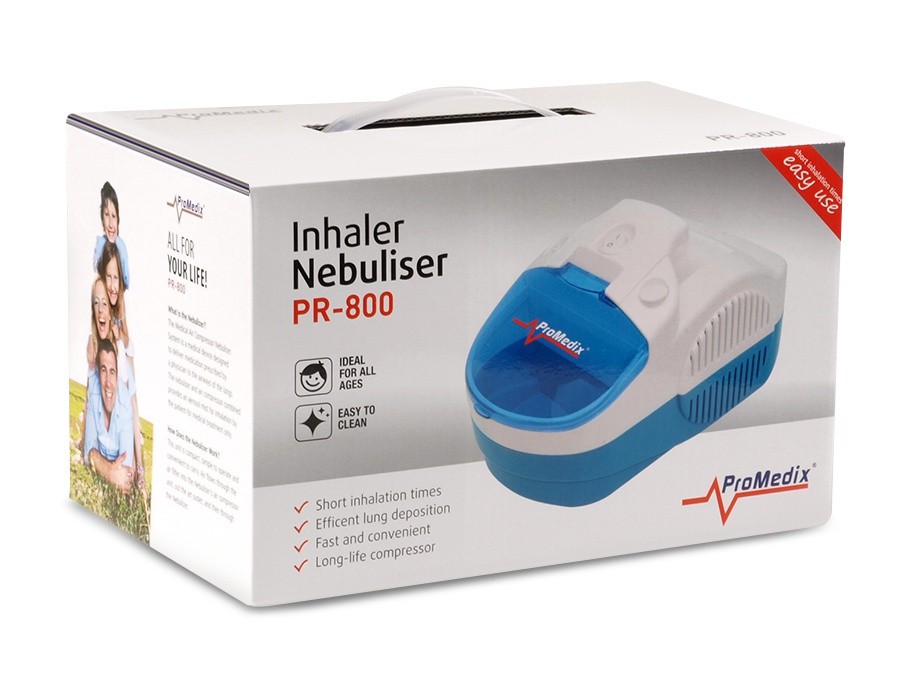 PR-800 Inhalator ProMedix / zestaw - nebulizator, maski, filterkiInhalator Promedix PR-800 został zaprojektowany do podawania przepisanego leku w celach profilaktycznych i leczniczych przy schorzeniach dróg oddechowych takich jak astma