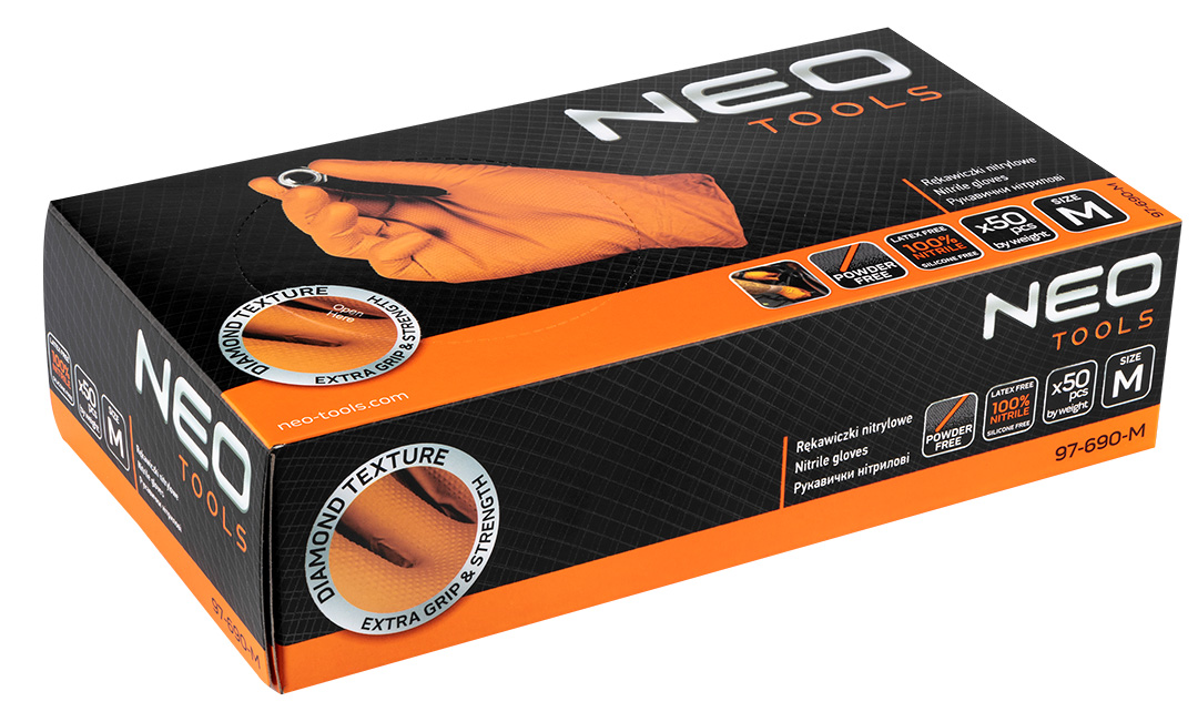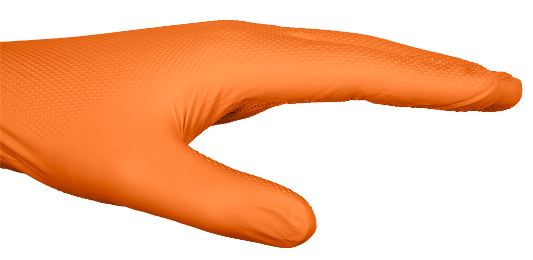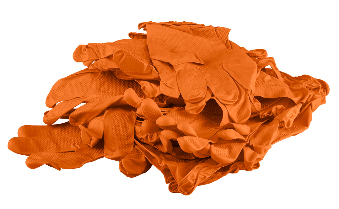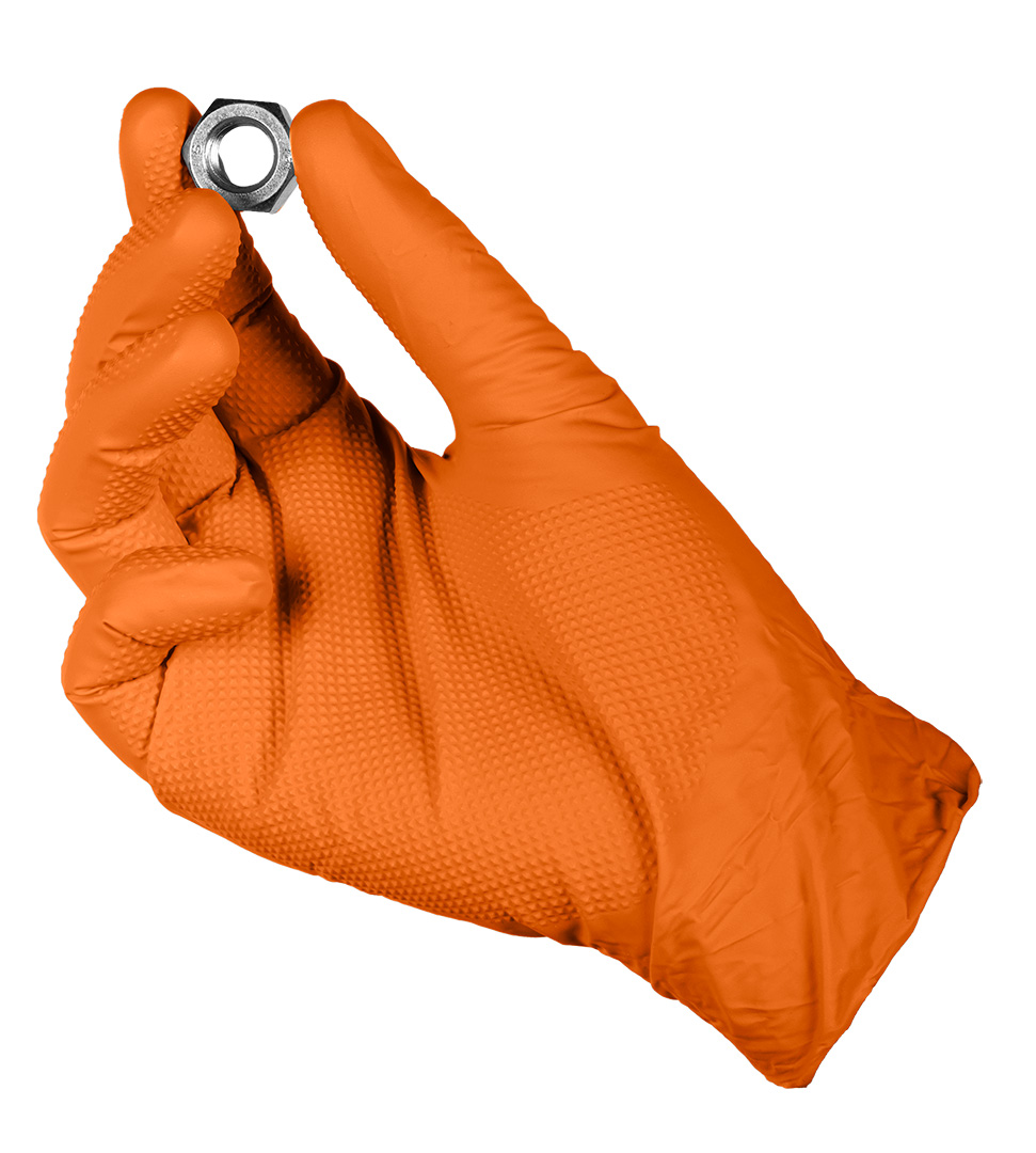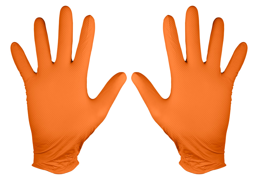 Rękawiczki nitrylowe, pomarańczowe, 50 sztuk, rozmiar M, mocniejsze niż zwykły nitryl, aby zapewnić większą odporność na przebicia i rozdarcia w najtrudniejszych warunkach, teksturowana powierzchnia diamentowa odprowadza płyny i zapewnia lepszą przyc