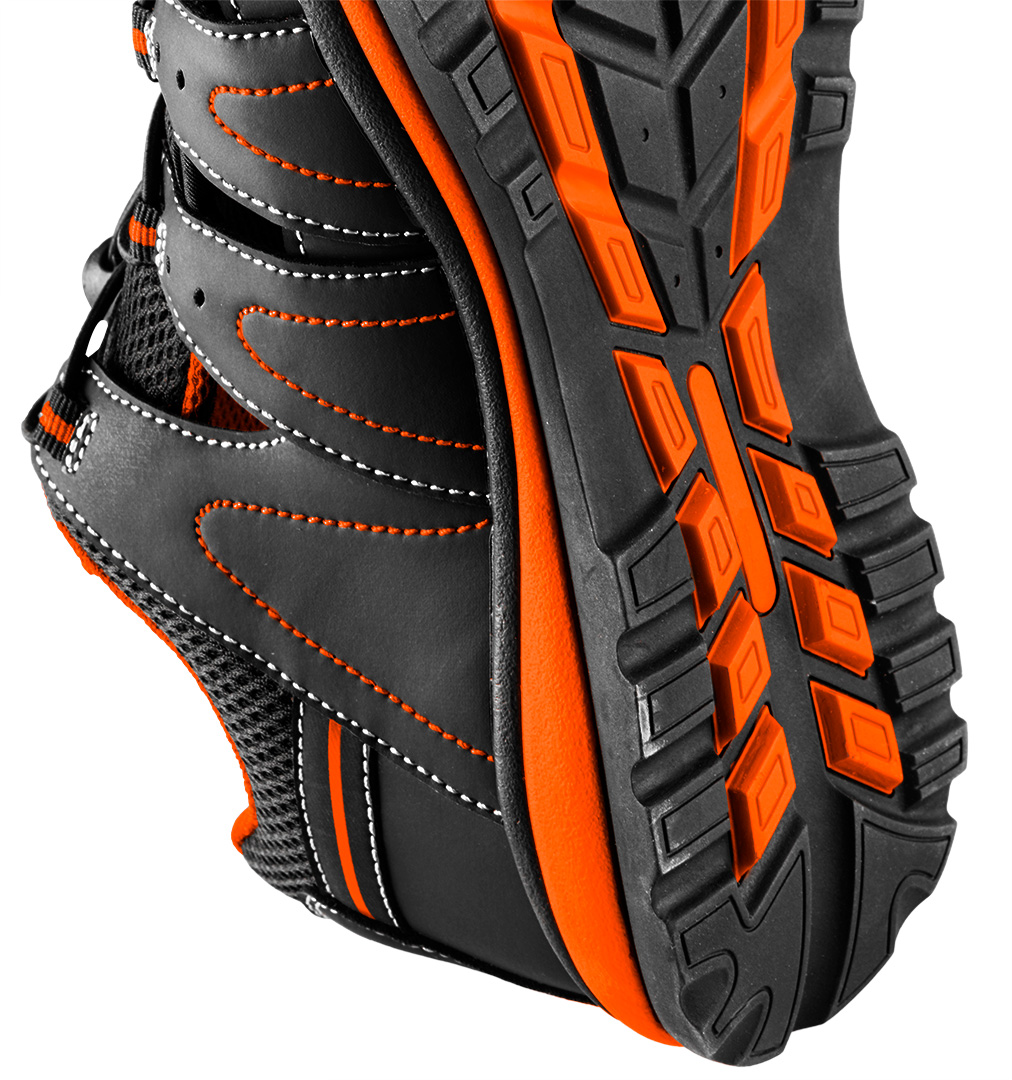 Sandały robocze S1 SRA, podnosek kompozytowy, tkanina siatkowa pokryta PU, dwumateriałowa podeszwa wykonana z EVA i gumy, podnosek z kompozytu, but wykonany w kategorii S1 SRA (SRA odporność na poślizg na podłożu ceramicznym pokrytym roztworem lauryl