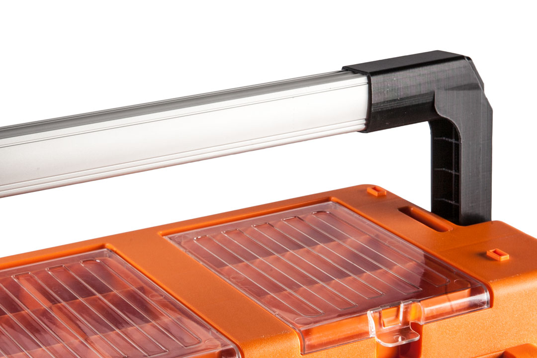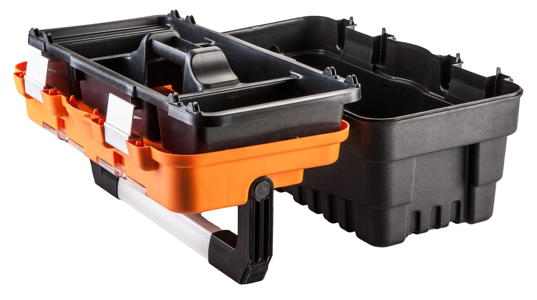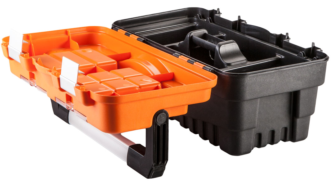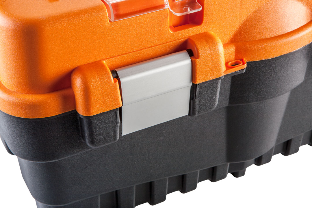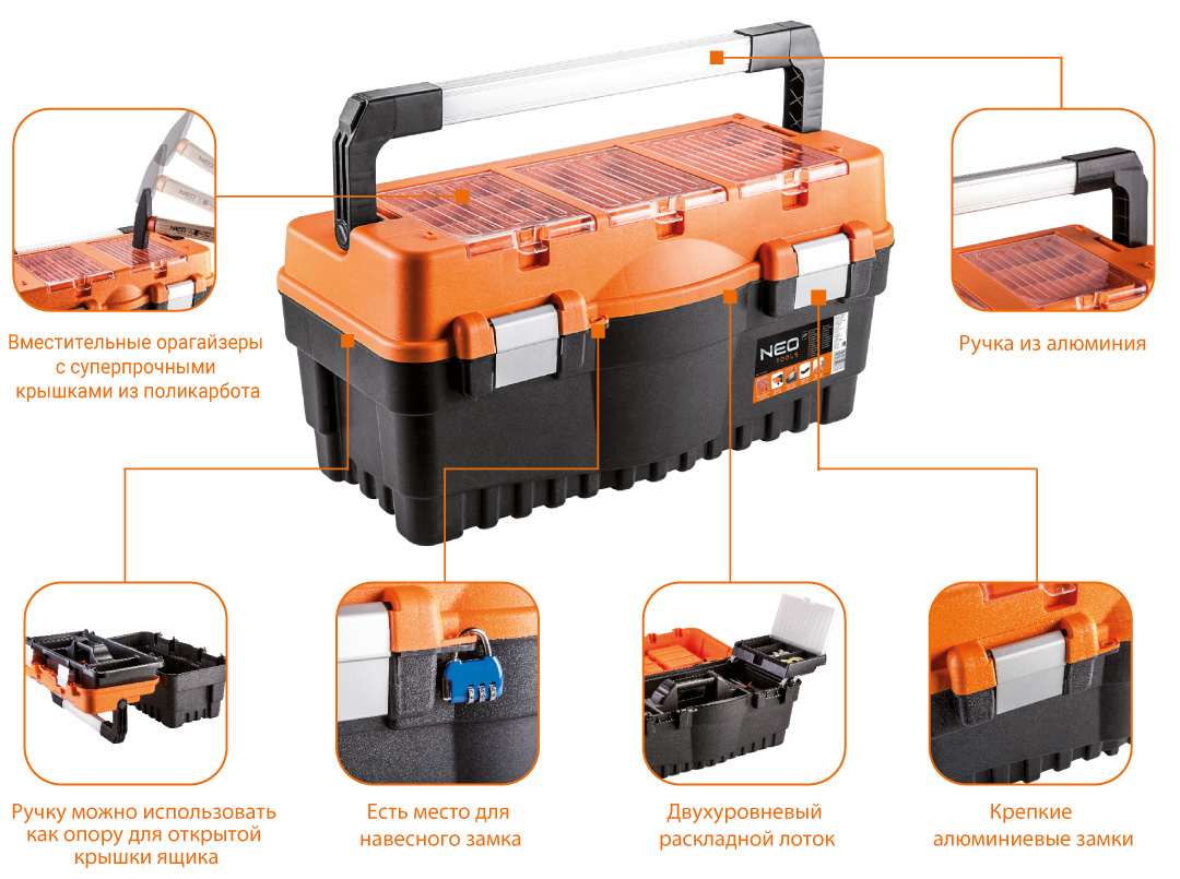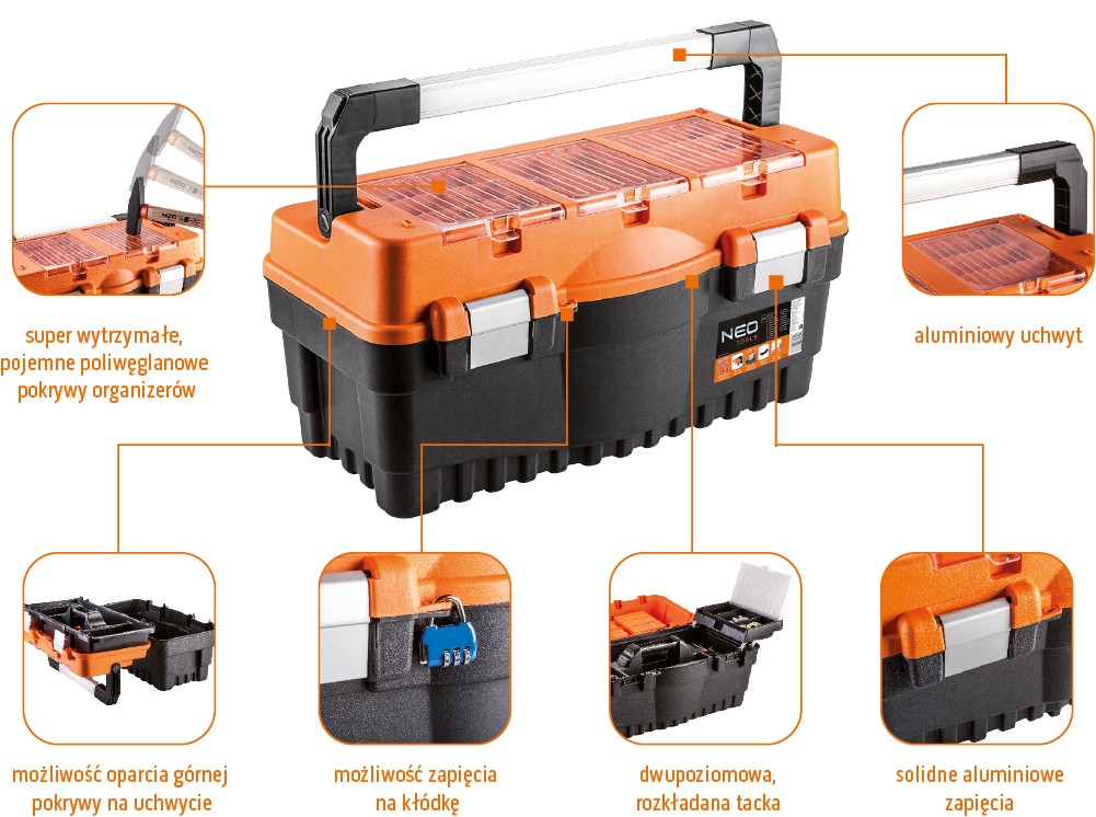 Skrzynka narzędziowa 18" NEO (nr ref. 84-102) wymiary 46.2 x 25.6 x 24.2 cm, aluminiowy uchwyt, aluminiowe zatrzaski, 2 organizery, poliwęglanowe pokrywy organizerów, rozkładana tacka, miejsce na kłódkę