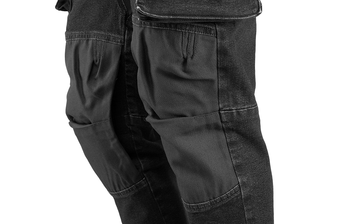 Spodnie robocze DENIM, czarne, wzmocnienia na kolanach, 98% bawełna, 2% elastan, dodatek elastanu zapewnia lepsze dopasowanie i większy komfort noszenia, wielofunkcyjne i pojemne kieszenie, w kroku i pod kolanem panel z bawełnianego Oxfordu podnosząc